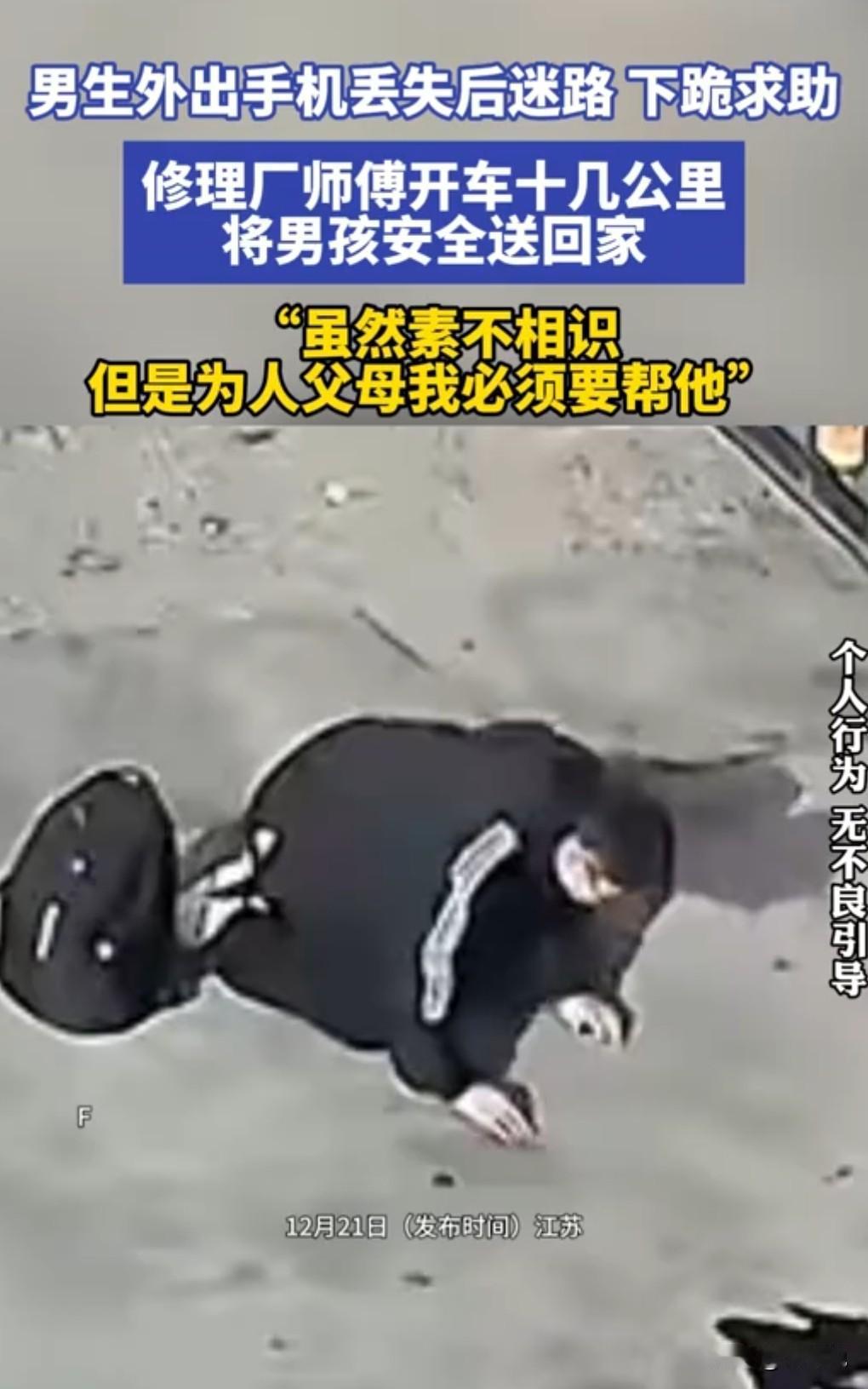 男孩膝下有黄金,不要随便下跪。 近日,江苏一名16岁男孩手机丢失迷路,他下跪向老板求助,老板开车十几公里送其回家。 老板还告诉男孩不要随便随便下跪,男儿膝下有黄金。 生活中遇到这种事情时,也可以找警察叔叔的。 这老板是个好人,将他送回家,他说自己也是当父亲的人,必须要帮他。