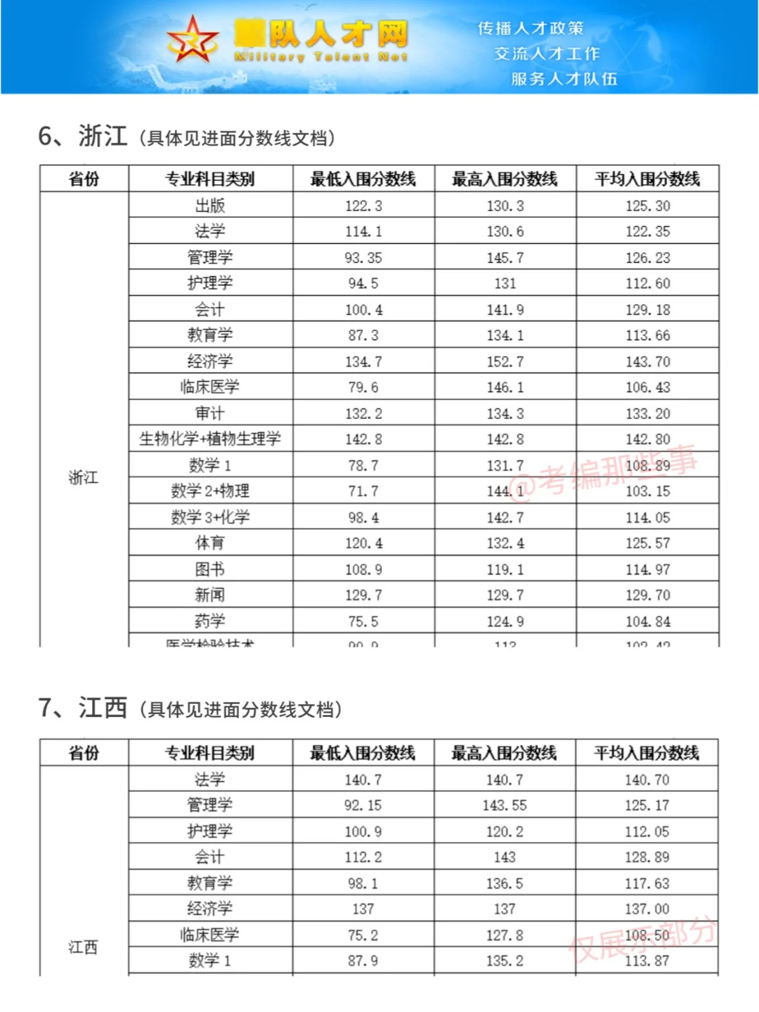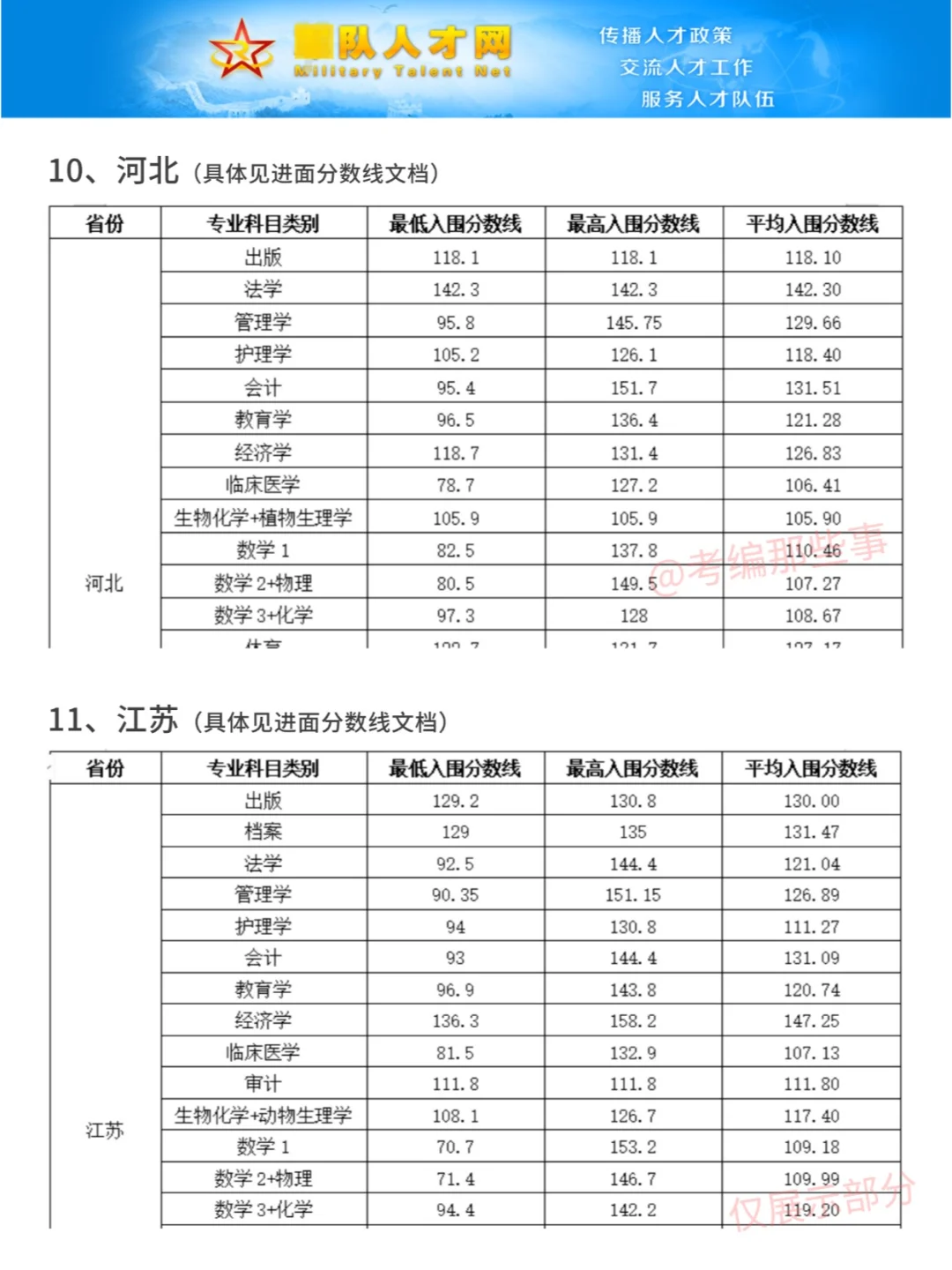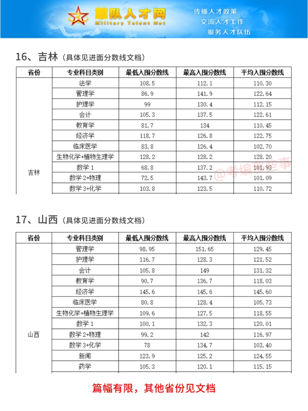 各省分数线~ 入围分数为公共科目、专业科目之和 公共科目相当于公基+职测 专业科目(分类别):出版、法学、管理学、护理学、会计、教育学、经济学、临床医 学、审计、生物化学+植物生理学、数学 1、数学 2+物理、数学 3+化学、体育、新闻、医学检验技术、医学影像技术、艺术基础综合、英语等 文职 文职备考 文职考试 25文职 2025文职 文职进面分数线 文职面试 文职笔试 进面分