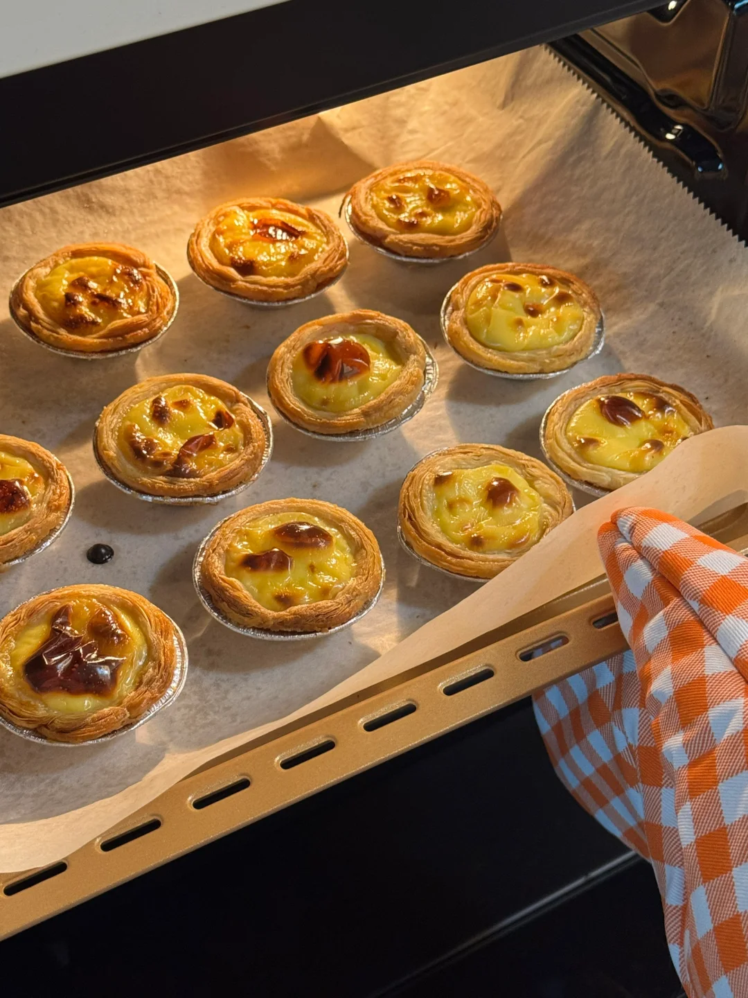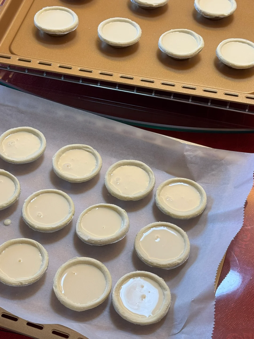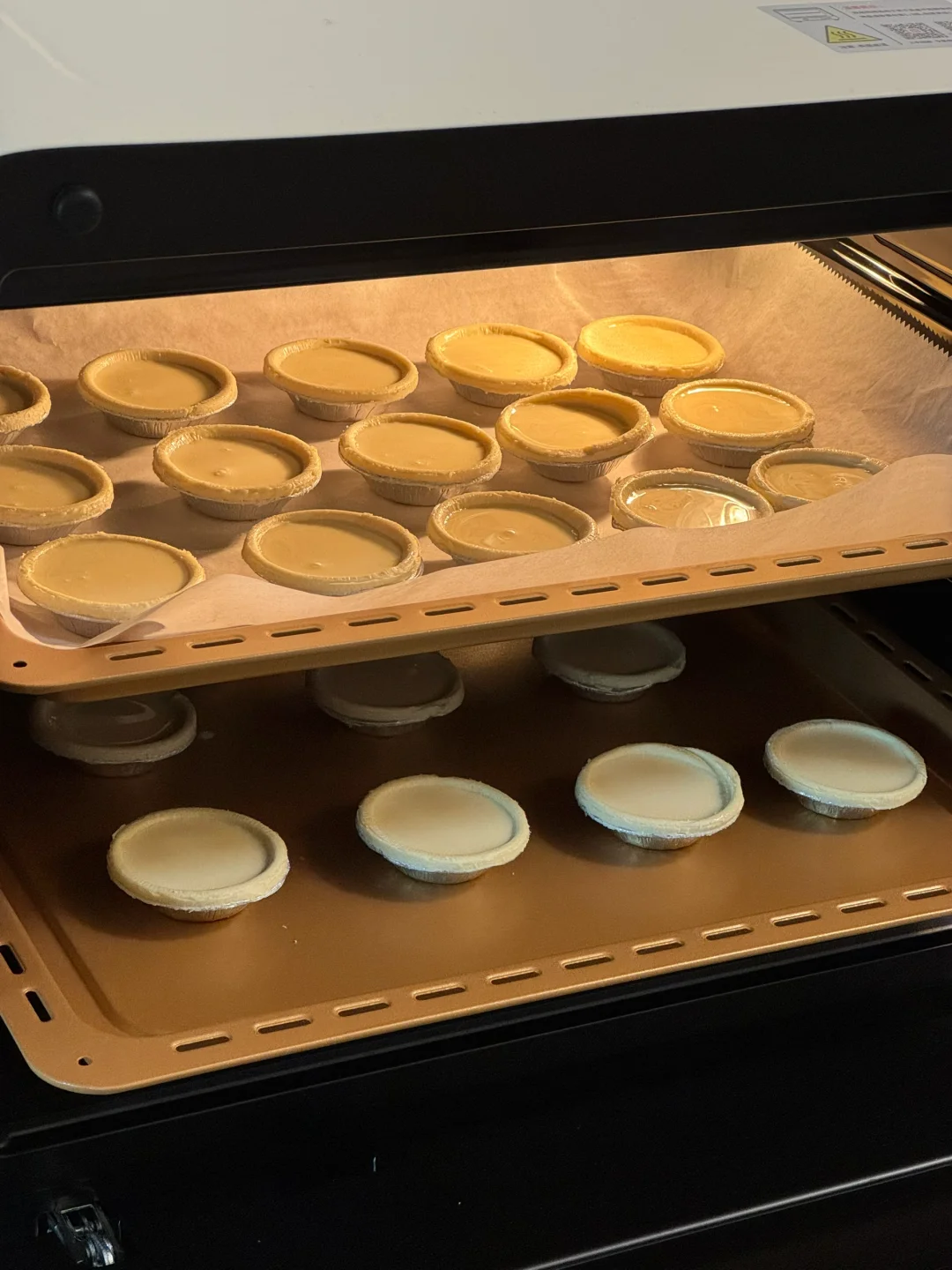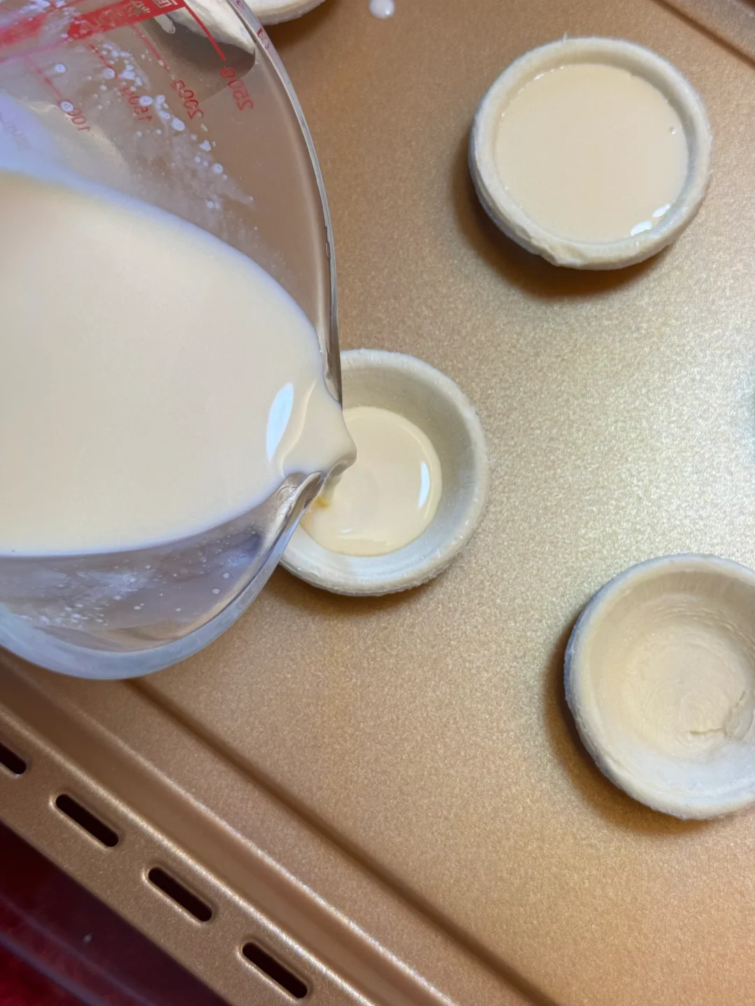 🌷此配方可做22个小蛋挞 🌷食材:纯牛奶100g,全蛋1个,蛋黄1个,淡奶油150g,细砂糖30g。 🌷做法:将以上食材搅拌至细砂糖融化。 过筛两次(必须过筛,内部嫩滑的关键) 在预热烤箱的时候,倒入蛋挞液(蛋挞皮不用解冻) 烤箱提前预热,200度烘烤25分钟(注意观察上色) 出炉后震一下热气,先不着急吃,晾凉后再吃(蛋挞皮用的俏侬的,凉了也很酥脆)