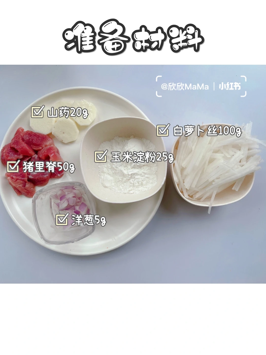 2️⃣猪肉和山药一起打成泥,全部食材加入碗里,搅拌均匀(一岁以上加一点酱油)