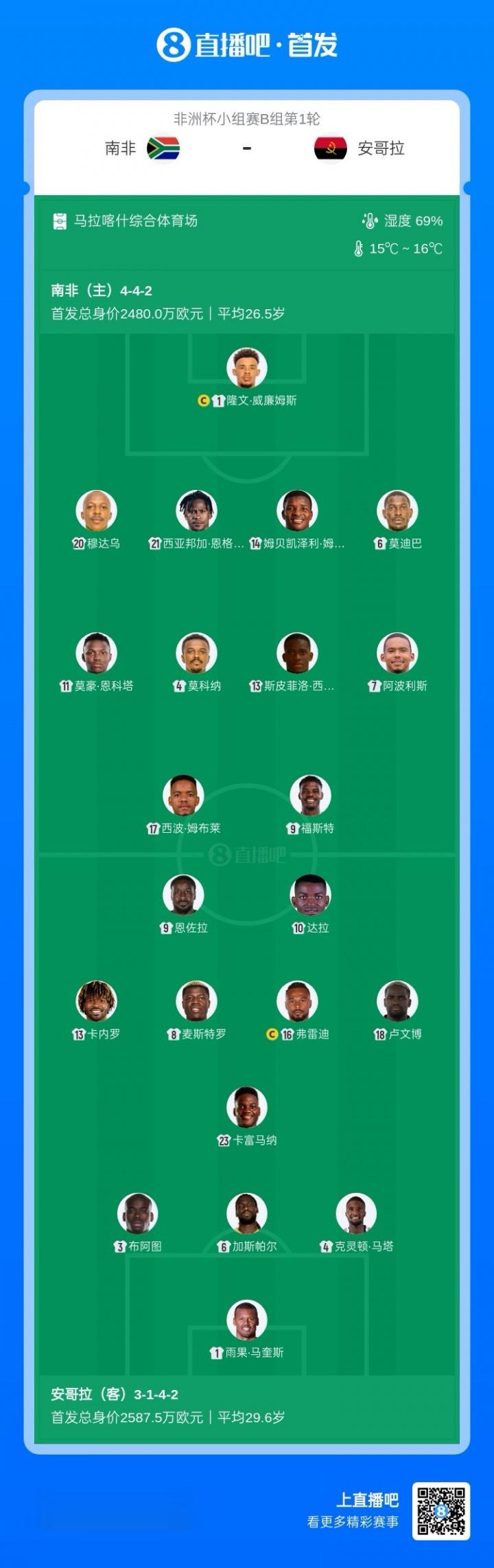 直播吧12月23日讯非洲杯B组首轮,南非vs安哥拉首发出炉。