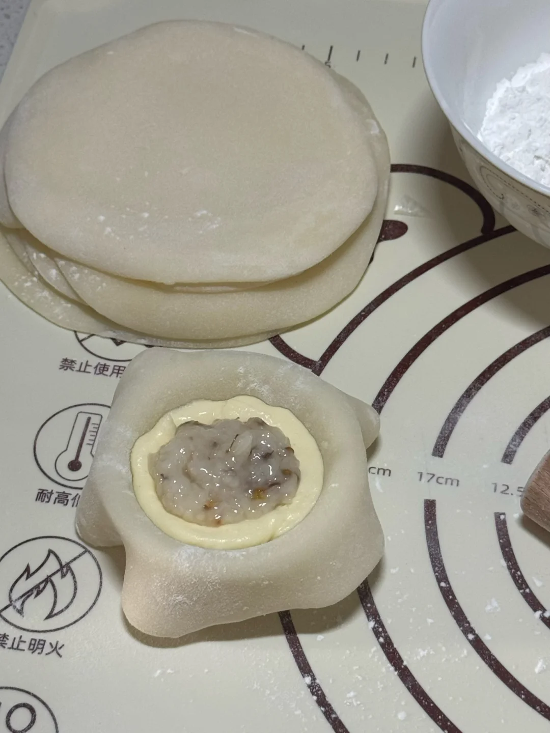 5.冷藏后面团均分成8份,擀成一个个圆形面皮(放熟糯米粉,避免粘连)