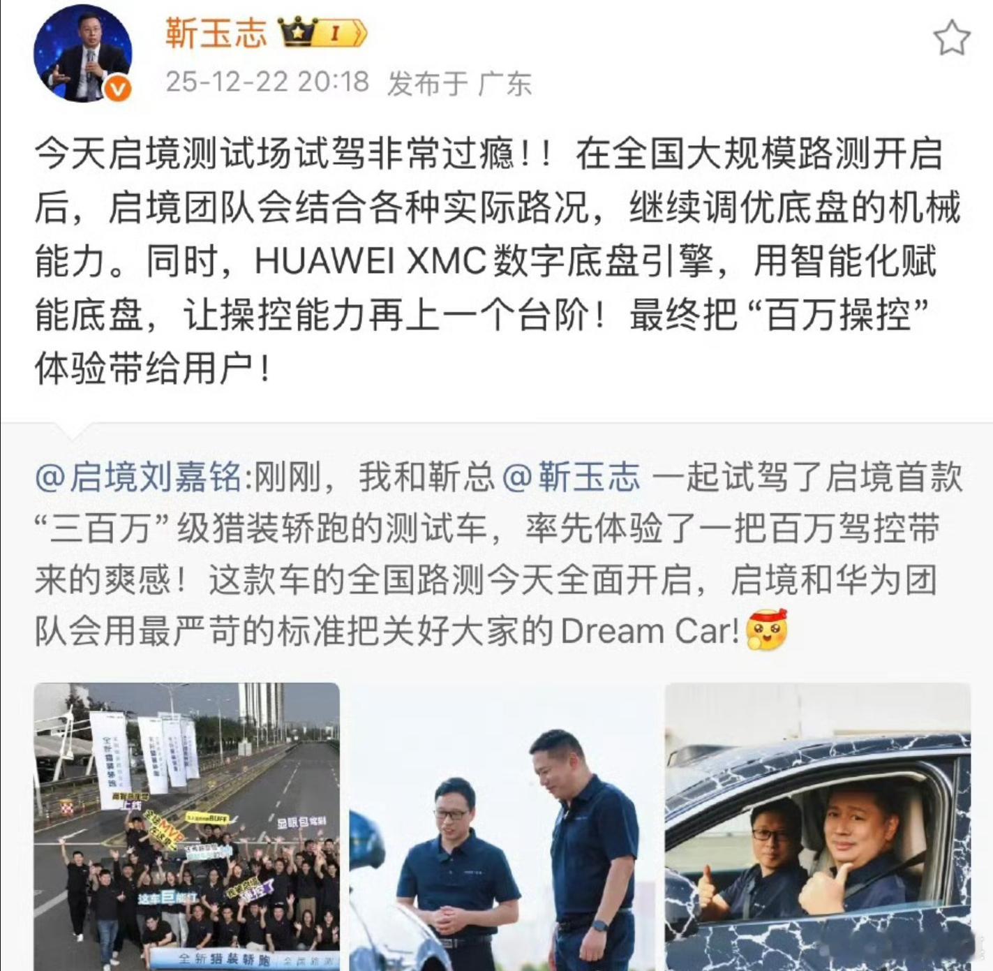 华为系首款猎装轿跑曝光三百万启境开启路测 说真的,看到这台车的时候,我脑子里已经浮现出开着它去追风的画面了!启境汽车这次和华为乾崑联手,真的把“猎装”这个词玩明白了。今天在广州看到实车路测,那个车身线条,优雅又带着点运动感,简直长在我的审美点上。关键是它不仅好看,还有华为的智驾加持,这以后长途自驾得多省心啊?听说这只是开始,靳玉志总和刘嘉铭总今天亲自验车,后面还要拉去全国20多个城市,什么极寒高温都要跑一遍。这种“特种兵”式的路测虽然辛苦,但为了咱们以后开得放心,也是拼了。真的很期待它上市后的表现,感觉会是下一台网红神车预定!