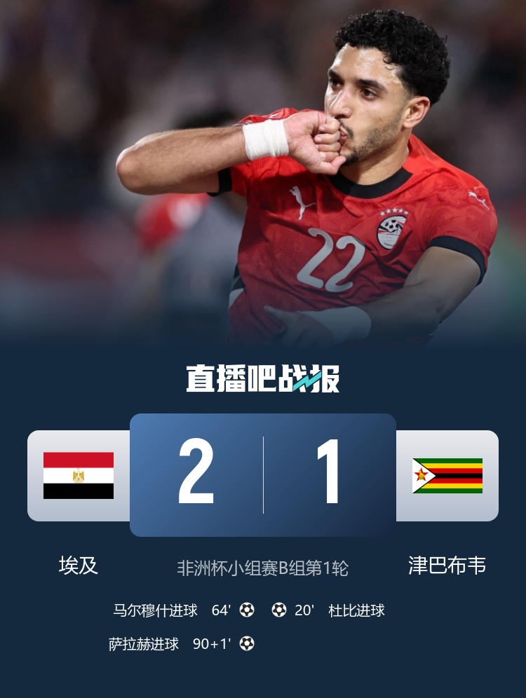 直播吧12月23日讯今天凌晨,埃及在非洲杯小组赛2-1击败津巴布韦,马尔穆什扳平比分,萨拉赫终场前绝杀。