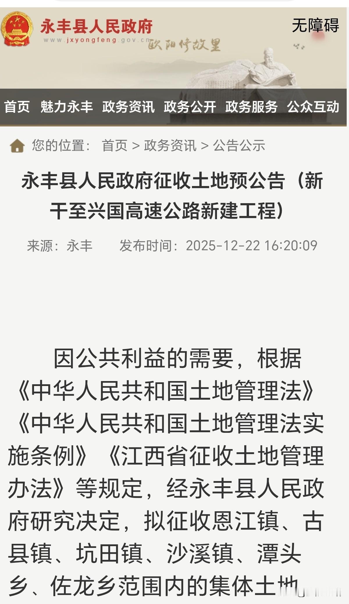 好消息!江西新干至兴国高速公路迎来重大新进展!吉安永丰县发布土地征收公告,这可是吉安市第2个发布土地征收公告的县。前几天,吉水县也发布了土地征收公告,如今就差新干县、峡江县和兴国县啦。 永丰县人民政府征收土地预公告(新干至兴国高速公路新建工程)显示,总共要征收5326亩土地,途经4镇2乡。 具体拟征收恩江镇、古县镇、坑田镇、沙溪镇、潭头乡、佐龙乡范围内的集体土地,面积约5326亩,这些土地将用于新干至兴国高速公路项目建设。 新干至兴国高速公路,规划在永丰县设置枢纽互通4处,其中落地互通2处,服务区一个。 1.坑田镇:设立永丰西互通,位于石派村附近。 2.恩江镇:设立永丰西枢纽与抚吉高速互通,位于流源村附近。 3.沙溪镇:设立永丰沙溪互通,位于坪山庙附近。 4.潭头乡:设立永丰南枢纽与莆炎高速互通,位于杨梅江村附近。 5.永丰西服务区:位于佐龙乡。 你是否期待新干至兴国高速公路的建设呢?