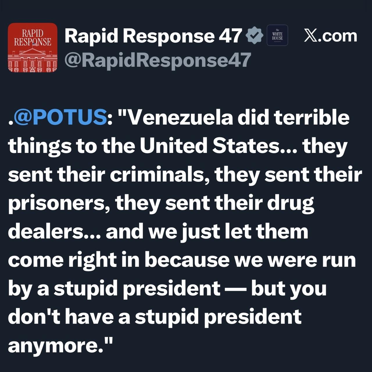特朗普:“委内瑞拉对美国做了可怕的事情……他们派来了罪犯、囚犯和毒贩……而我们却让他们直接进来,因为我们当时的总统很愚蠢——但你们现在没有愚蠢的总统了。”
