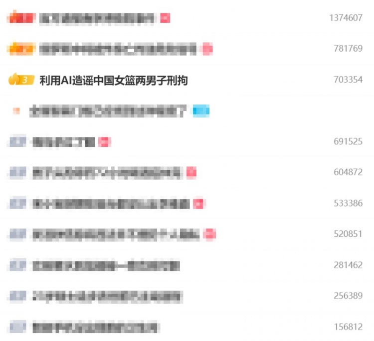 今天上午,“利用AI造谣中国女篮两男子刑拘”词条已经登上微博热搜榜第3。