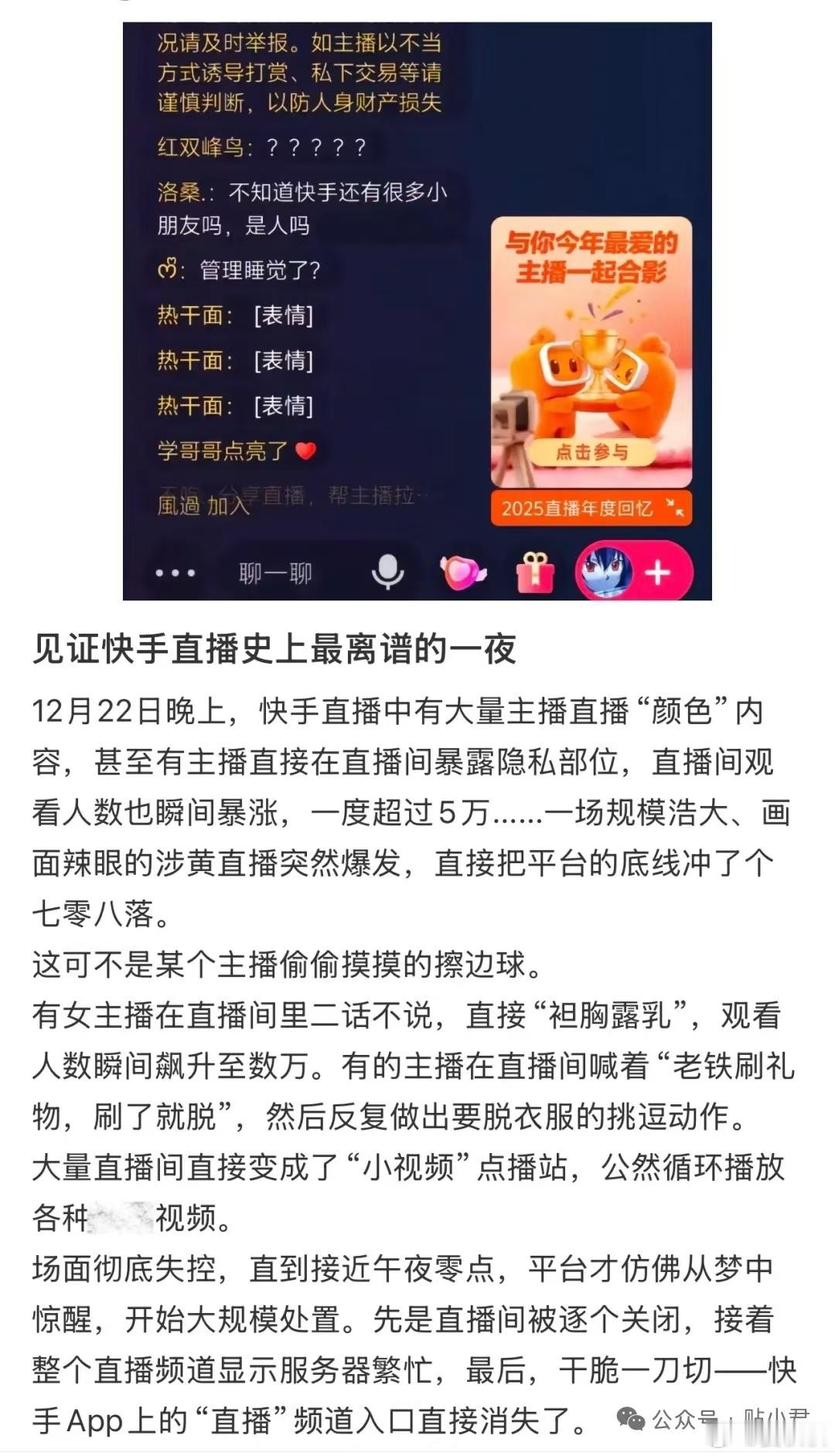 快手沦陷如果这两天,你的朋友突然莫名其妙问你借钱,或者给你发不明链接,千万警惕。他有可能,是昨天(22日)晚上,看了快手的直播。昨晚,短视频平台快手经历了一场罕见的大规模、突发性内容安全危机。约22时起,平台内多个直播间,几乎同时出现播放淫秽影片、进行低俗表演等严重违规内容,部分直播间观众超过十万。与此同时,大量观看快手直播的网友发现,一旦点击了直播间的不明链接,自己的微信即被盗,并出现“群发好友借钱”的状况。大量网友表示,自己尝试举报,但平台毫无反应,导致违规内容持续扩散。一直到内容失控近两小时后,快手才采取被视为“熔断”的终极措施,强制中断了大量直播,甚至波及部分正常直播间,前端入口一度出现异常。今天凌晨,快手官方回应媒体,表示为“黑灰产组织有预谋的恶意攻击”,并表示已启动应急机制,并向公安机关报案。有网友形容,这是互联网公司直播平台的“切尔诺贝利时刻”。此次事件暴露出的,远超一次简单的“攻击”。它直接对快手平台的审核机制,以及在商业流量与内容安全之间的平衡机制,提出了挑战。尤其从明年1月1日起,新修订的《治安管理处罚法》明确,向好友发淫秽信息,也是违法。此外,平台的“未成年人保护机制”,也遭到严重质疑。内容安全的应急底线在哪里,这是平台必须回答的紧迫课题。快手称遭到黑灰产攻击晏秋秋