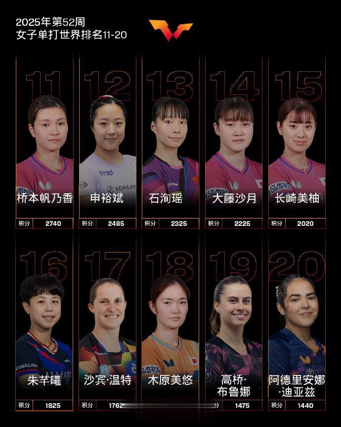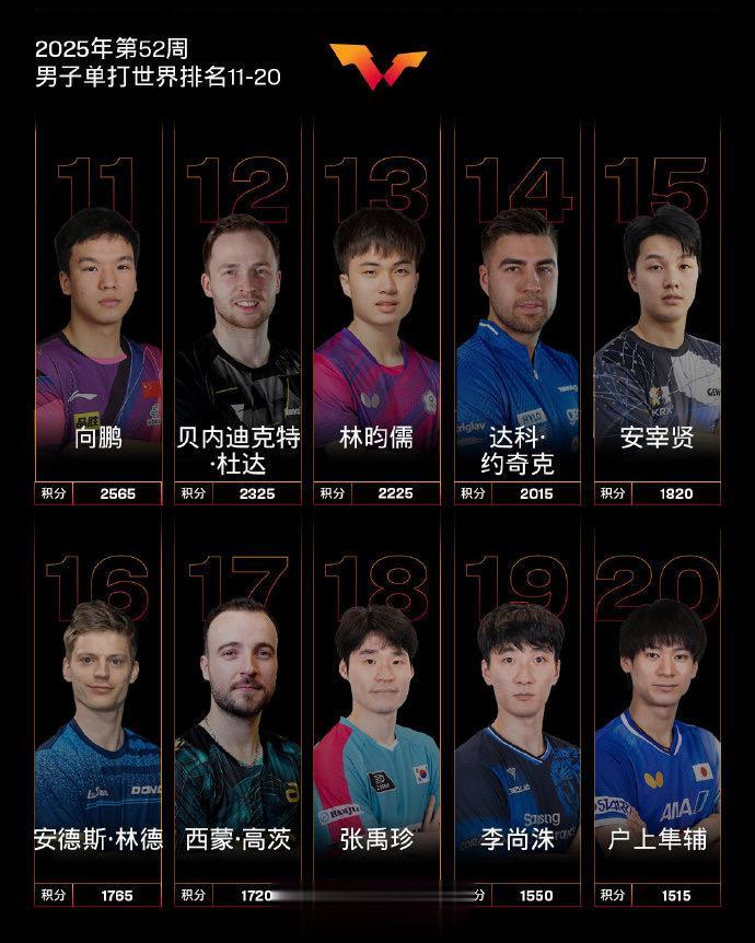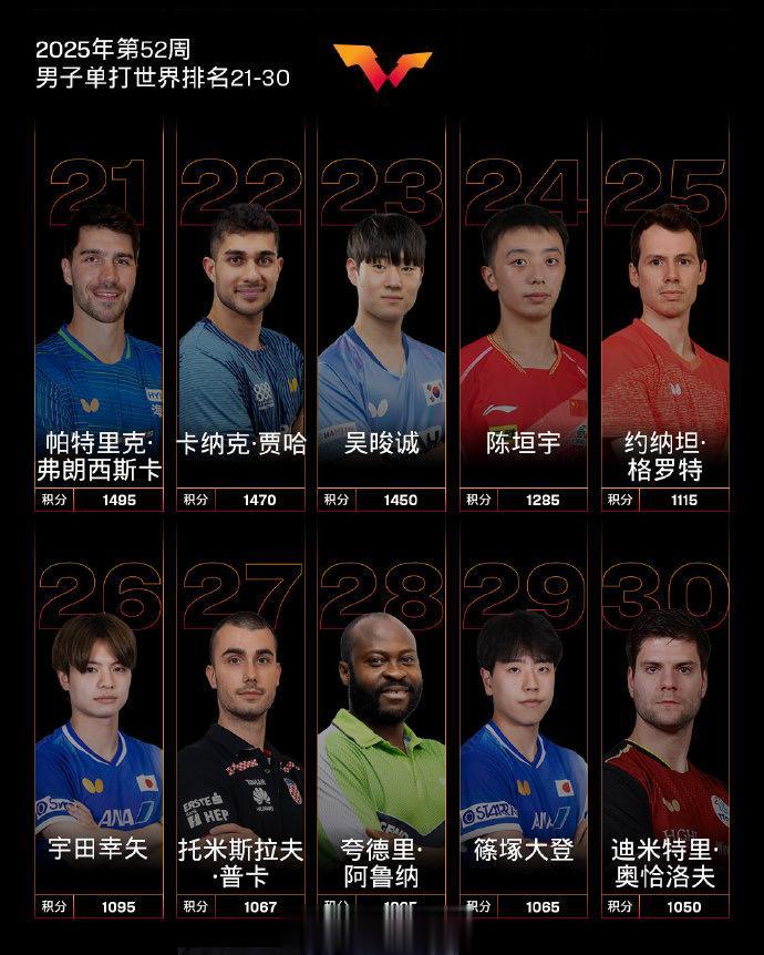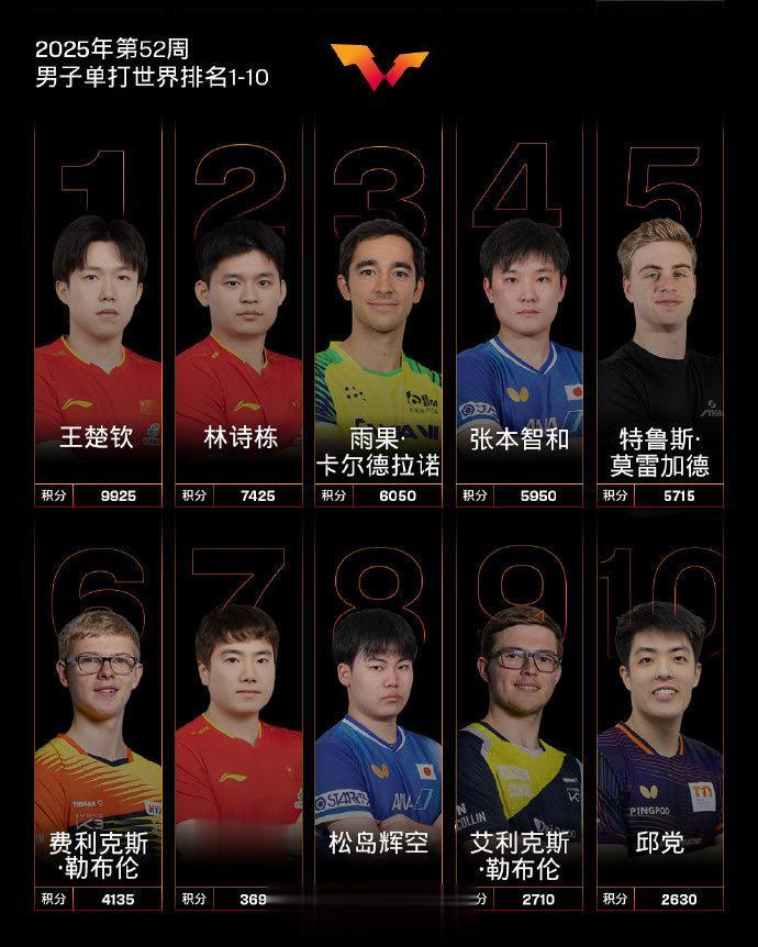 虎扑12月23日讯国际乒联发布2025年第52周世界排名,具体如下: