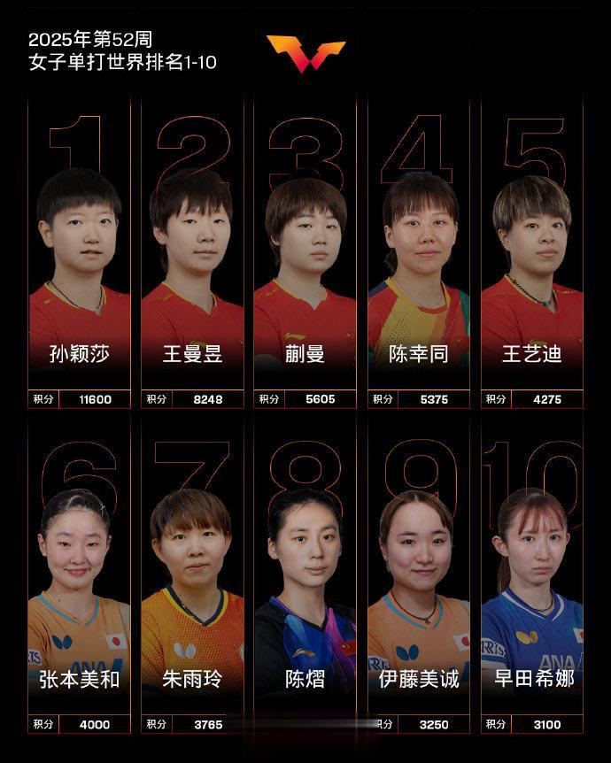 女子单打,中国队球员孙颖莎、王曼昱、蒯曼、陈幸同、王艺迪位列前五,陈熠位列第八。