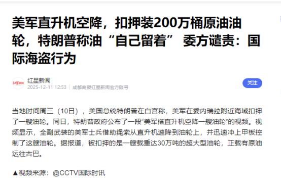 美国扣押了第二艘200万桶原油巨轮,并据消息称,这是由委国前往中国的油轮,属于中国公司。这次,国人集体愤怒了,美帝用行动证明了他们一贯秉承的强权即真理的强盗逻辑。 这事儿发生在12月20号凌晨,地点就在巴巴多斯以东的国际水域,被抢的船叫“世纪号”,挂着巴拿马旗,实际是香港一家海运公司在运营,船上那近200万桶原油,产权明明白白归中国一家大型石油企业所有,目的地就是国内的炼油厂。 当时油轮正安安稳稳地航行,压根没料到祸从天降,美国海岸警卫队的直升机直接悬在头顶,全副武装的队员顺着绳索滑到甲板上,没要任何国际授权,也没出示合法搜查令,几分钟就控制了驾驶舱和通讯室,整套动作熟练得像演练过无数遍,活脱脱就是海上强盗的做派。 更气人的是,美国国土安全部长诺姆还特意在社交媒体上发了扣船视频,配文写着“我们会找到你,我们会阻止你”,那嚣张劲儿仿佛自己干了件多正义的事。 可稍微细查就知道,这艘“世纪号”根本不在美国公布的任何制裁名单上,之前也多次合法运送委内瑞拉原油到中国,连美方自己的媒体CNN都报道了这个关键细节。 没在制裁名单上,又拿不出正式查封令,最后只能用“核查巴拿马注册有效性”这种蹩脚理由搪塞,说白了就是明抢。 这已经是12月里美国第二次干这种事了,10号的时候他们就扣了另一艘叫“Skipper号”的油轮,同样是载着委内瑞拉原油的相关船只,直接把船上110万桶原油拖到休斯敦港,摆明了要据为己有。 委内瑞拉副总统罗德里格斯气得直接骂街,说这是赤裸裸的“盗窃和劫持”,就是国际海盗行为;委外交部也发了公告,直言美国这是违反《联合国宪章》的殖民主义行径,肯定会被挫败。 要说美国有多霸道,得提个关键事实,他们至今都没批准《联合国海洋法公约》,却天天以“维护规则”为名在公海上拦别人的船。这次扣船用的所谓“反恐法律”,压根没经过联合国安理会授权,纯属自己给自己找借口。 更离谱的是,有知情人士爆料,美国策划这事儿好几个月了,目标就是拦截更多委内瑞拉石油运输船,切断这个国家最重要的经济支柱,哪里是什么反恐,分明是有组织的资源掠夺。 特朗普12月16号还公开放话,要对所有进出委内瑞拉的受制裁油轮全面封锁,结果转头就扣了不在制裁名单上的“世纪号”,自己定的规矩自己先破,说白了就是强权大于一切。 自从这两起扣船事件发生后,加勒比海的航运秩序全乱了,不少载着原油的船宁愿停在委内瑞拉水域,也不敢冒险出海,就怕被美国无端截留。 可能有人还记得32年前的“银河号”事件,当时美国也是无凭无据说中国货轮载了违禁品,强行登船搜查,最后啥也没查到,连句道歉都没有。 三十多年过去,美国的套路一点没改,反而越来越嚣张,就在上个月,他们还在印度洋上拦了一艘从中国驶往伊朗的货轮,以“涉嫌载军民两用物资”为由,强行登船销毁了部分货物,全程没给任何令人信服的证据。 事件发生后,中国外交部第一时间就严正交涉,明确说美方这行为缺乏任何国际法依据,是典型的单边制裁和“长臂管辖”,要求美方立即纠正错误,承担全部后果,中方肯定会坚定维护中企的正当权益。 不光是中国,伊朗、古巴、巴西这些国家也站出来支持委内瑞拉,伊朗外长还专门给委外长打电话,说美国这是国际恐怖主义行径,愿意全方位合作一起反击。 美国的小算盘其实很清楚,表面是制裁委内瑞拉,实际是一石三鸟:抢人家的石油资源,推高国际油价利好自己的页岩油产业,顺便敲打中国,遏制中国在南美地区的影响力。 可他们显然打错了主意,现在的中国早就不是三十多年前那个只能吃哑巴亏的中国了,中企合法权益受侵害,中方肯定会拿出实际行动维权。 截至目前美国虽然喊着要没收原油,但进程一直拖拖拉拉,估计也知道真把这200万桶油吞了,不仅要面临中方的强力反制和国际诉讼,还会遭到全世界对其违反国际法的谴责。 国际社会的规矩,从来不是靠某一个国家的拳头定的。美国总想着用自己的国内法管全世界,把公海当成自家后院,想扣谁的船就扣谁的船,这种强盗逻辑迟早会翻车。这次国人集体愤怒,不光是因为油轮被扣,更是看不惯这种恃强凌弱的行径,大家都清楚,只有坚定反击,才能让霸权主义知道,不是谁拳头大谁就有理。