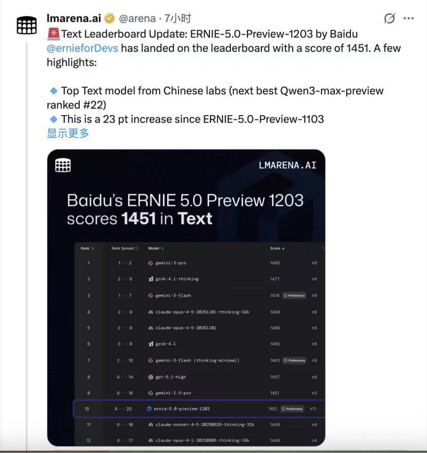 【中美AI正面对决:从国际榜单看国产AI的整体进阶】 12月23日,国际知名大模型竞技场LMArena最新文本榜单出炉,一个亮眼的中国名字让全球AI界侧目。 文心新模型ERNIE-5.0-Preview-1203以1451分登顶国内第一,力压Claude-Opus-4-1、GPT-5.2等一众国际顶尖模型,跻身榜单前列。尤为振奋的是,在这份榜单的前20名中,它是唯一一个非美国模型。这不仅是一个模型的胜利,更是国产AI在国际舞台上,打破长期垄断格局的一次铿锵发声。 曾几何时,提起全球顶尖大模型,人们的目光总会习惯性聚焦于美国。从技术框架到评测标准,从核心算法到应用落地,美国模型长期占据着话语权高地,国产模型则被贴上“跟跑者”的标签,艰难追赶。 但变局正在悄然发生。以文心大模型为代表的中国力量,从未停下深耕的脚步。从11月8日ERNIE-5.0-Preview-1022拿下文本榜全球并列第二、国内第一,到11月22日ERNIE-5.0-Preview-1120摘得视觉理解榜国内第一,再到如今的全新突破,文心5.0系列预览版的每一次亮相,都在刷新外界对国产AI的认知。 这份底气,源于其原生全模态的硬核实力。作为新一代全模态大模型,文心5.0打通了文本、图像、音频、视频等多模态数据的壁垒,实现了从“单一模态处理”到“全模态融合理解与生成”的跨越。在创意写作的灵动表达里,在高难度指令的精准执行中,在智能体规划的缜密逻辑间,它展现出的理解、逻辑、记忆与说服力,不仅在40余项权威基准评测中达到全球领先水平,更让“国产智造”有了实打实的技术支撑。 LMArena 的榜单,从来不是冰冷的数字堆砌,而是全球用户对模型真实能力的投票。文心 5.0 Preview 能够在这场无差别竞技中脱颖而出,恰恰证明,国产大模型已经摆脱了“模仿跟随”的桎梏,站在了与国际顶尖模型同场竞技的赛道上。 这不是一个模型的孤军奋战,而是中国AI产业厚积薄发的缩影。从底层技术的攻坚克难,到应用场景的持续拓展,无数科研人员与企业的投入,正在凝聚成改变全球AI格局的力量。当文心5.0 Preview在国际赛场上崭露头角,我们看到的不仅是一个模型的排名跃升,更是中国科技自主创新的坚定步伐。 更让人期待的是,这还只是“预览版”的实力。随着1月文心5.0正式版的即将上线,格局又会发生什么变化?我们有理由相信,它将带来更多惊喜。从“追赶者”到“领跑者”,文心大模型的进阶之路,正是中国科技突破封锁、迈向自主自强的生动注脚。在全球AI的浪潮中,属于中国的智能篇章,正在徐徐展开。