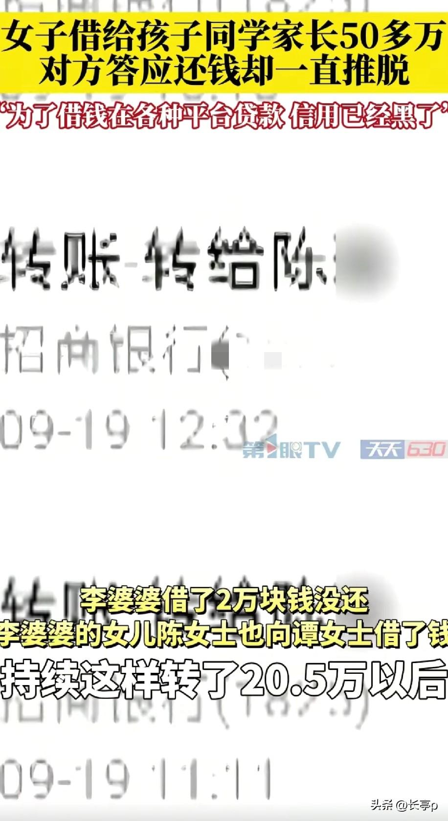 谭女士借给自己家孩子的同学家长 50多万,一开始这位同学的家长说 家里人生病了挺严重 谭女士就借给她了一万,过了几天借钱的家长,又找谭女士借了一万,说过几天就会还给她 就这样持续的借给这位家长20.5万 后来这位家长说给谭女士百分之十的利息,还是找谭女士借钱 谭女士找亲朋好友借了些又贷款前后借给这位家长57.5万 对方说10月份还钱,到现在一点都没还,现在谭女士的信用也黑了 而借钱的家长说,因为工作的关系正在跟公司打官司,才拖了这么久,现在正在想办法卖房子来还给谭女士 心软的谭女士现在估计非常后悔 竟然把自己家的老本都借完后,还继续借,这也太好心肠了,至于对方承诺的利息,很有可能是个幌子,现在主要把本钱要回来就不错了。