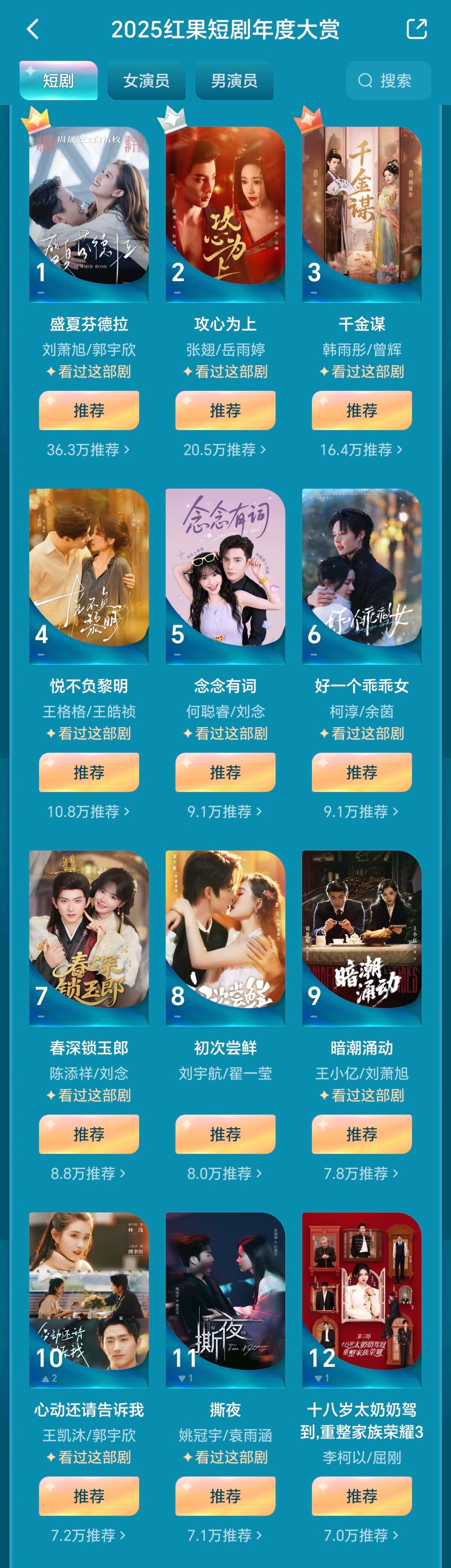 红果年度大赏投票前十应该不会有大变化了盛夏芬德拉all in,郭宇欣>剧>刘萧旭