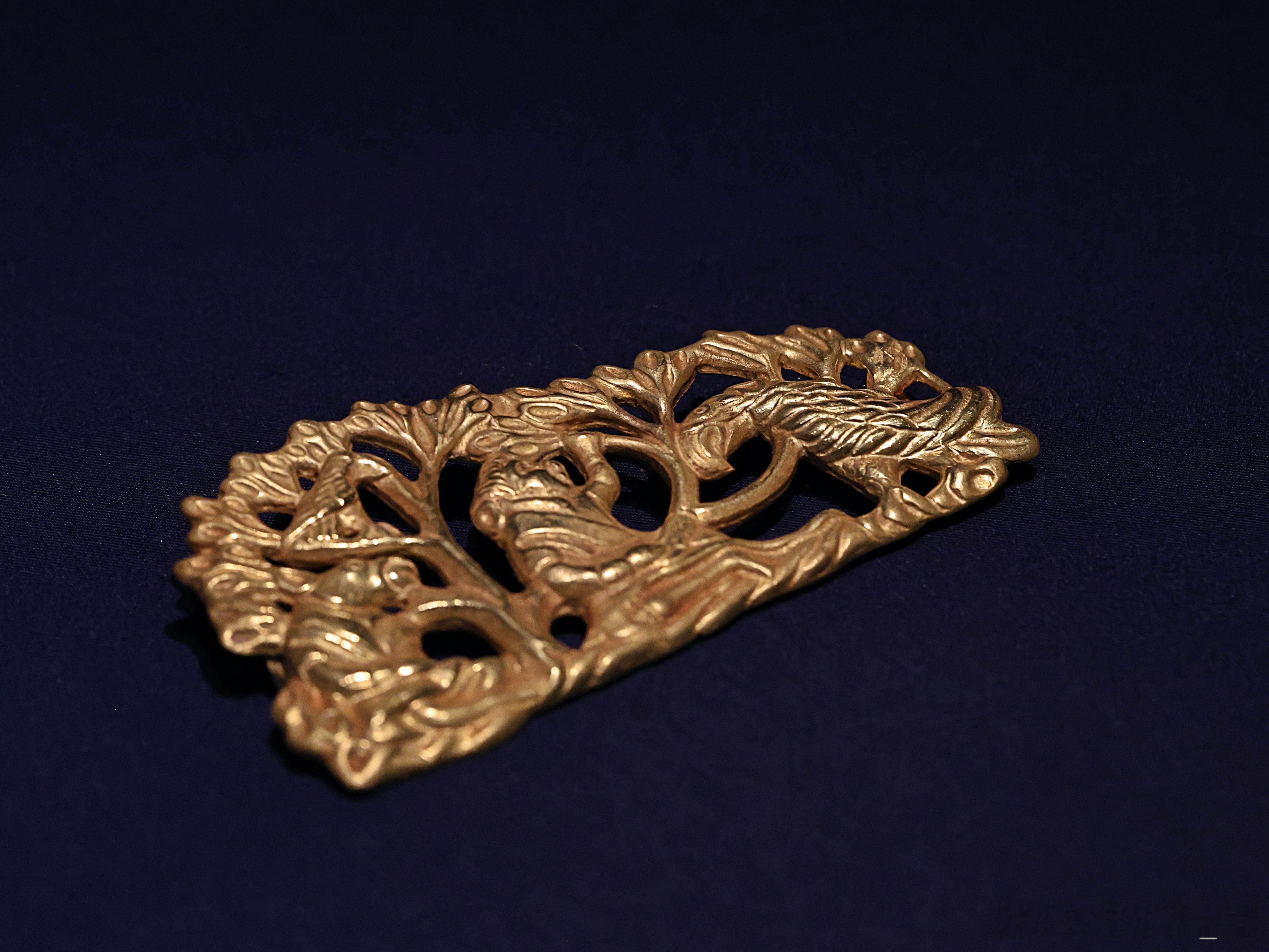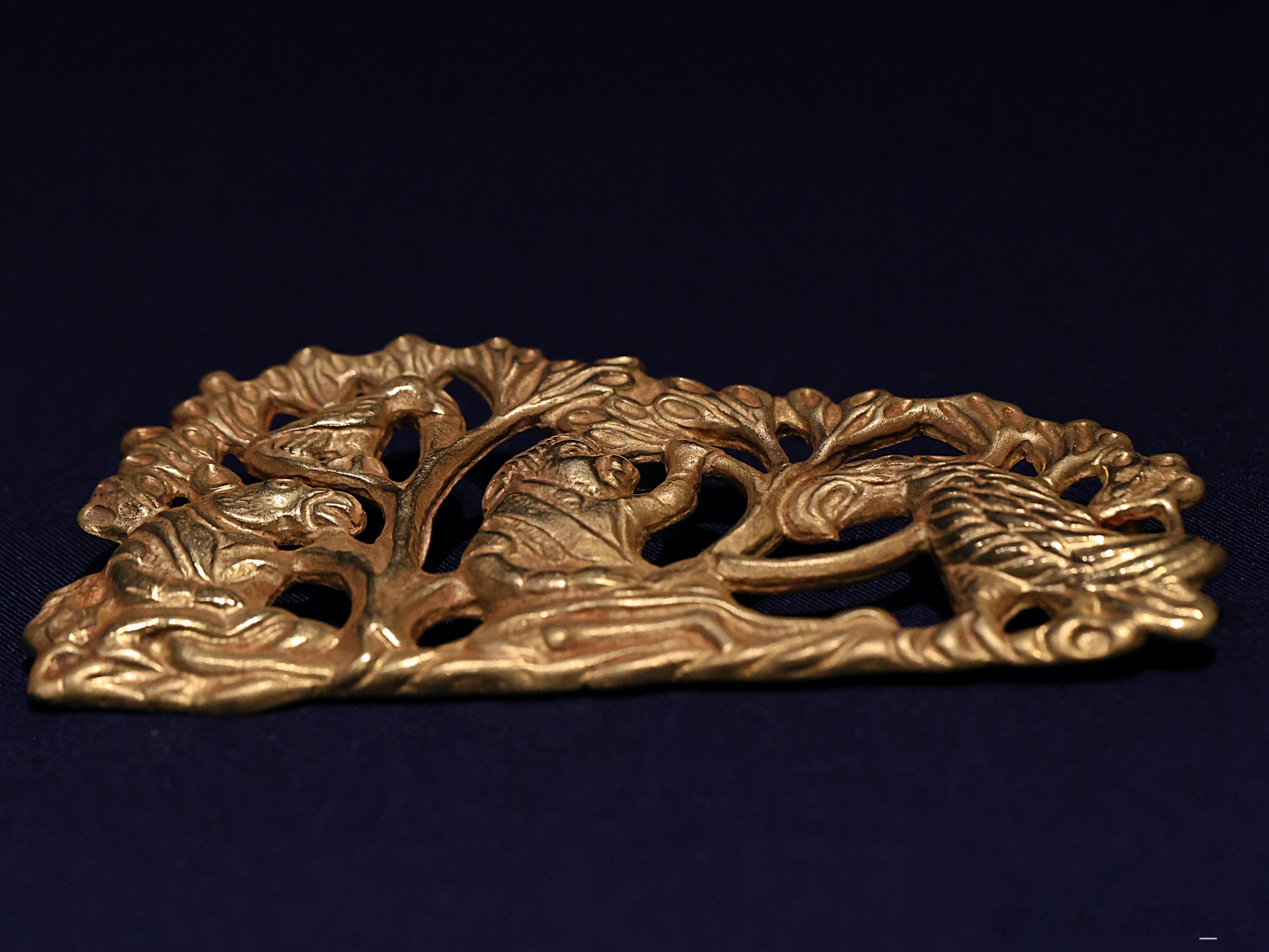 黄金缕-香港故宫文化博物馆藏古代金器 人物鸟兽形饰牌公元前3–前2世纪这件饰牌有一人,左侧饰有一猛兽,右侧有一长喙尖耳猛禽。另有一只尖喙鸟站立于左侧树枝之上,中间的人物亦盘坐在树下,左手握树枝。摄于首都博物馆2025.11.8