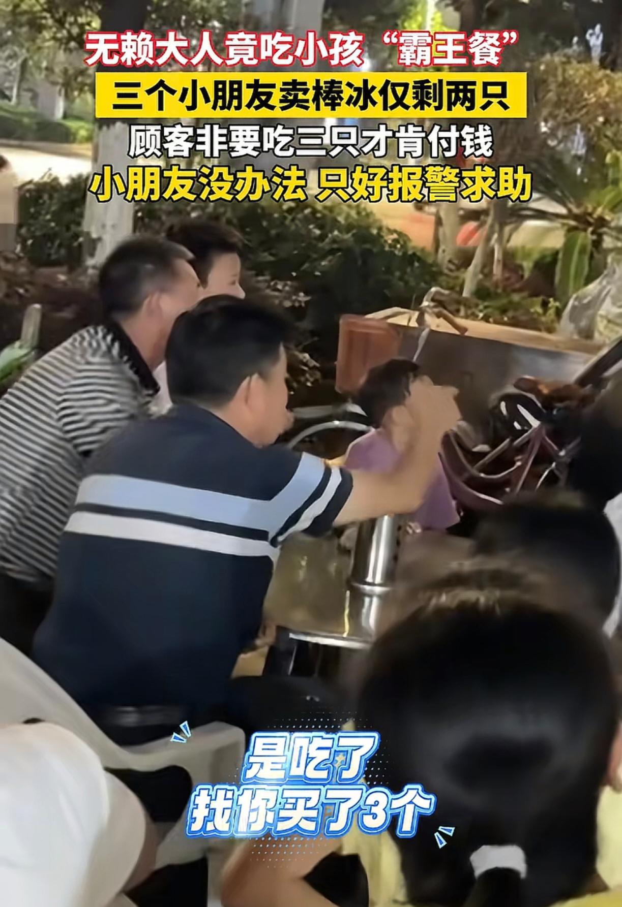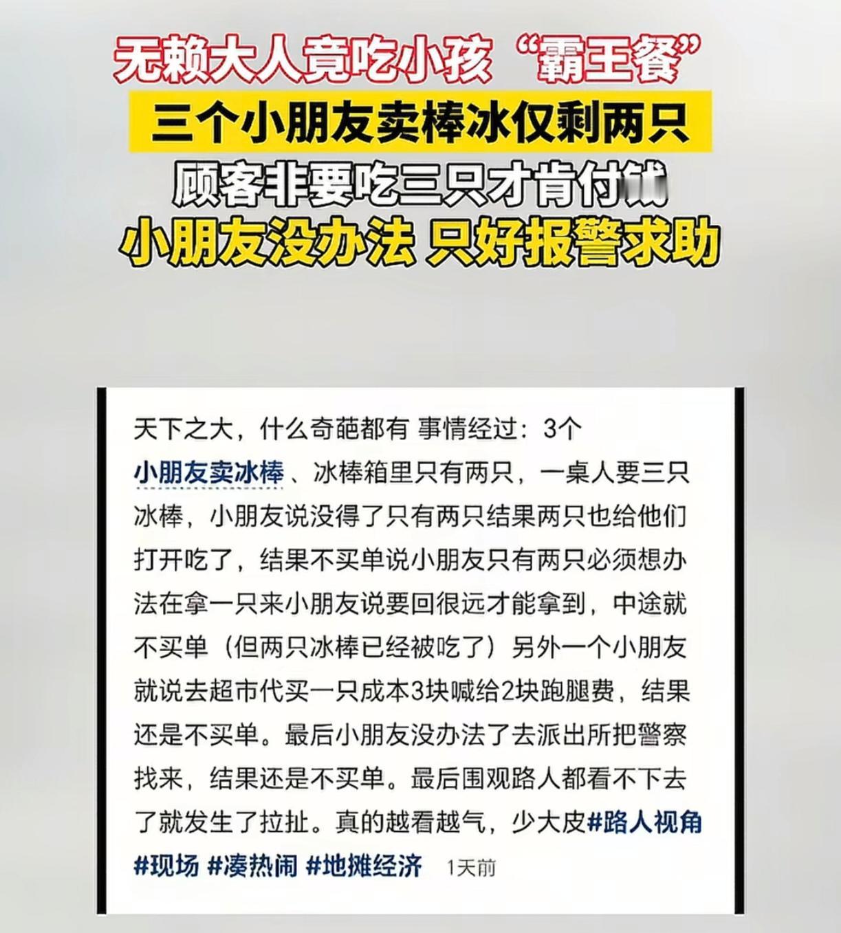 我的天,几个大人因为一根冰棍和小孩子干起来,还惊动帽子叔叔,真有出息! 贵州烧烤店小朋友卖冰棍这件事,一开始以为他们是逗小孩子玩的,没想到是真吃霸王餐,一桌吃烧烤的大叔大妈为难两个小孩子。 明知道小孩子冰棍卖完只剩2根了,他们吃完后非说要三根才跟付钱。 附近一个穿白衣服的大哥看不下去,跟他们干了起来,要不是有帽子叔叔拦着,非打起来不可了。 后来还是烧烤店的老板娘自掏腰包给小孩子付了钱。 网友表示:低了一辈子头,他们终于能在小孩子面前抬起头了。 要我说,就应该恢复几十年前的通报制度,凡是做这类丑事的,都通报单位和所在社区,把前因后果都写上,并且附上照片,贴在单位和小区门口,给大家看看他们的丑脸。 三根冰棍值多少钱,这都要欺负小孩子,真是服了。