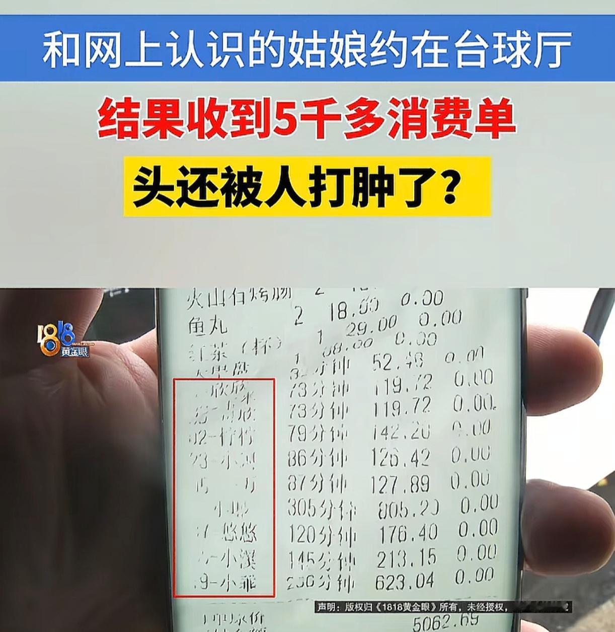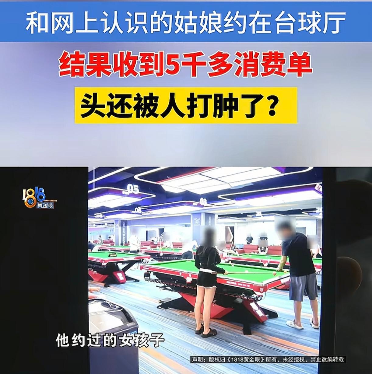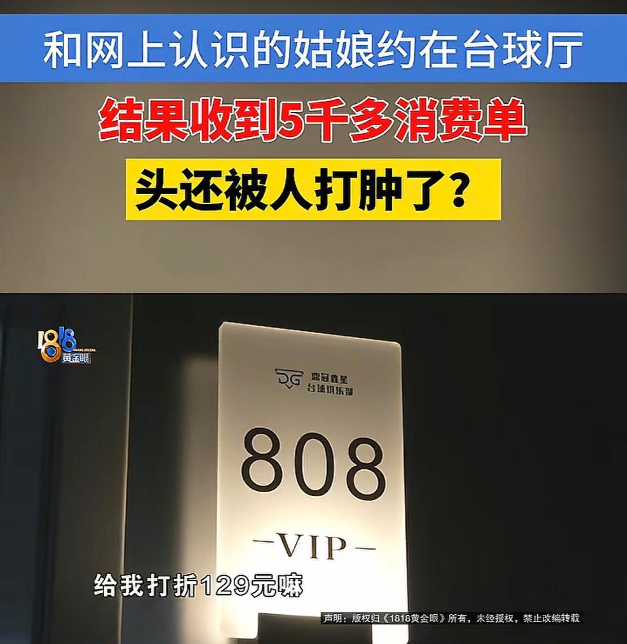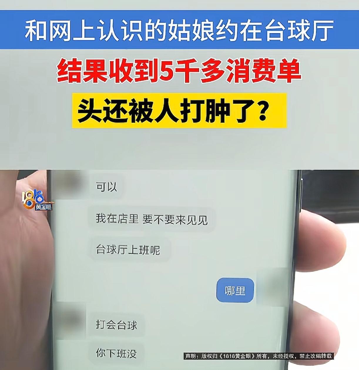 这明明就是约妹子,结果吃不到还把自己搭进去了,不服反过来把人告了! 浙江杭州,一男子在网上认识一个姑娘,聊了几天想约见对方,还提出私密要求,还问姑娘嫁不嫁。 姑娘看到这样的信息也不恼火,反而问男子在哪里,要不要见面聊聊。 随后两人就约在姑娘上班的台球厅见面,谁知道两人相处4个小时下来,男子却收到一张5000多的消费账单,他认为不合理,就和对方理论,吵着吵着就打了起来,男子的头被打肿了。 网友表示:这位大哥也是好样的,和10个助教吃好喝好,玩了半天,结果钱不想付,还反过来要求台球厅赔付医药费。 当然,男子之所以被打,也是因为他不想支付这5000块钱,被认为是想白嫖的。 但男子认为他是被坑的,一开始说好的打完折是129元玩4个小时,谁知道女子助教还叫其他助教小姐妹进来。 说的好听是陪男子聊天,但目的就是要间接让男子花钱买单,每个助教都按时长计算费用,硬生生把台球厅干成灰色产业了。 后来,男子还是付了600块钱,但他要求台球厅赔他医药费。 对此,你怎么看呢?