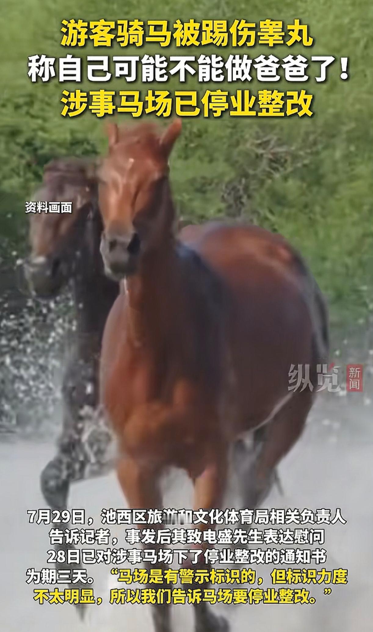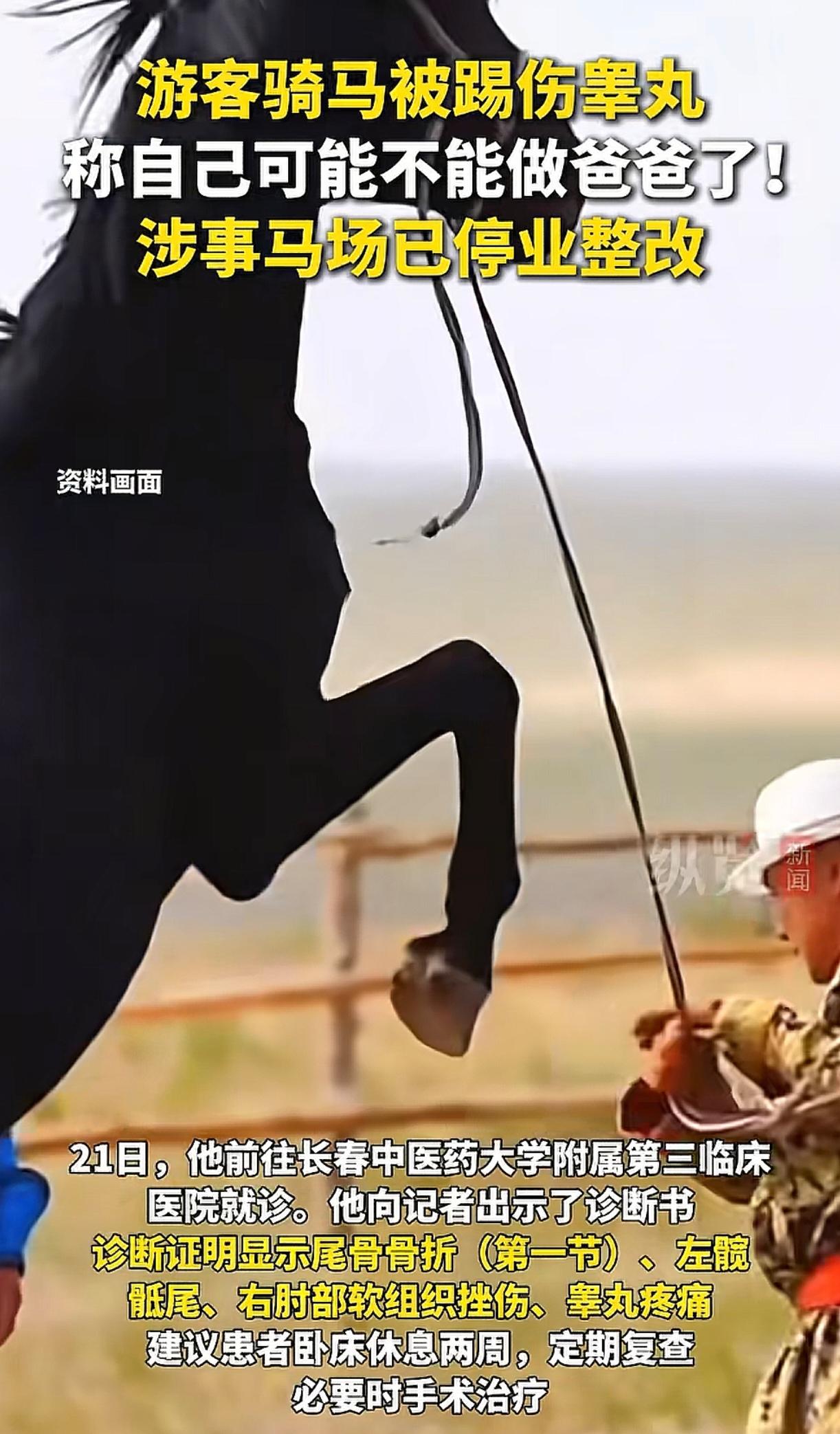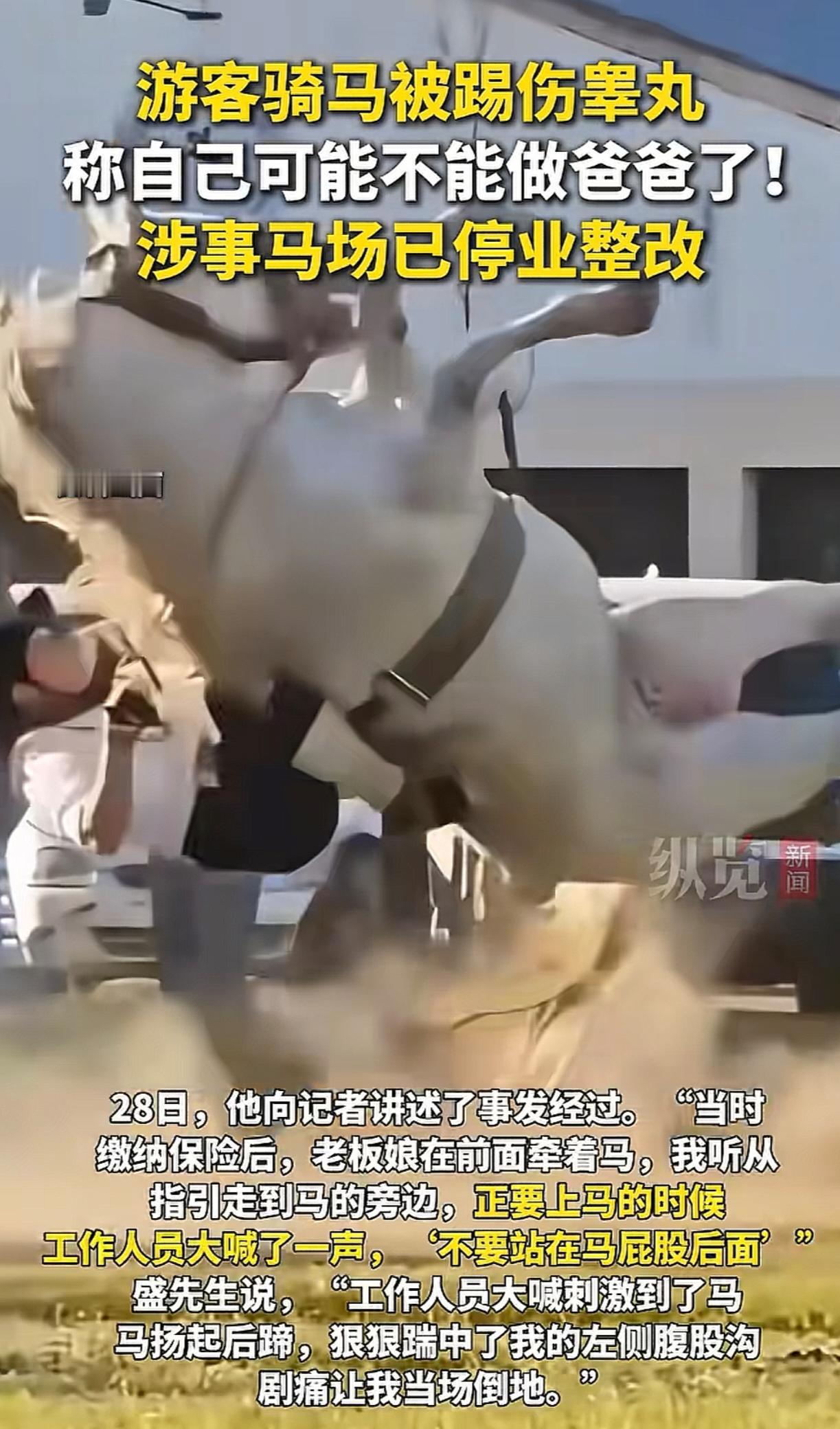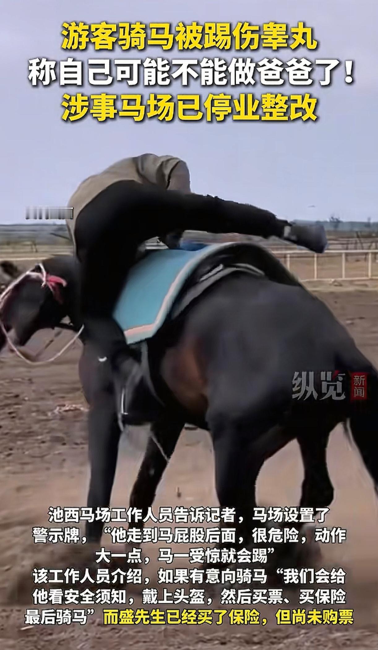 看着都感觉痛!吉林长白山一名游客在一马场准备骑马时,被突然惊吓的马儿踢伤睾丸,男子称:自己可能不能做爸爸了! 据男子透露,他当时听从指引走到马的旁边,准备要上马时,工作人员突然大喊刺一声“不要站在马屁股后面”。 然而,这一声却刺激到马儿了,他就是这样被受刺激的马儿踢伤的。 网友表示:工作人员挺有意思的,说男子已经买了保险,但还没买票,是想推卸责任的意思吗? 要我说,保险都已经买了,还能差这一张票钱,也许马场工作人员是想承担少一点责任吧! 目前,马场也已经被责令停业整顿了,还是要加强安全防范措施。 对此,你怎么看呢?