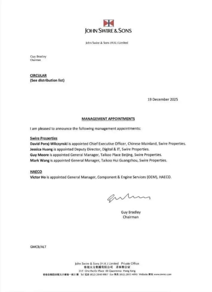 根据公开信息,DavidPoraj-Wilczynski毕业于牛津大学,其工作经历覆盖太古多个板块,具备完整的集团内部培养与跨领域领导经验。