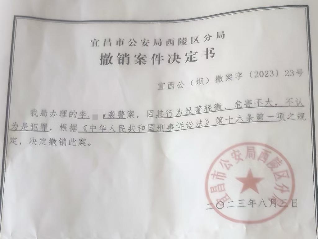 2023年8月9日,李某珍接到西坝派出所电话称,她被指袭警罪一案已撤案。宜昌市公安局西陵区分局2023年8月3日开具的一份《撤销案件决定书》称,该局办理的李某珍袭警案,因其行为显著轻微、危害不大,不认为是犯罪,决定撤销此案。