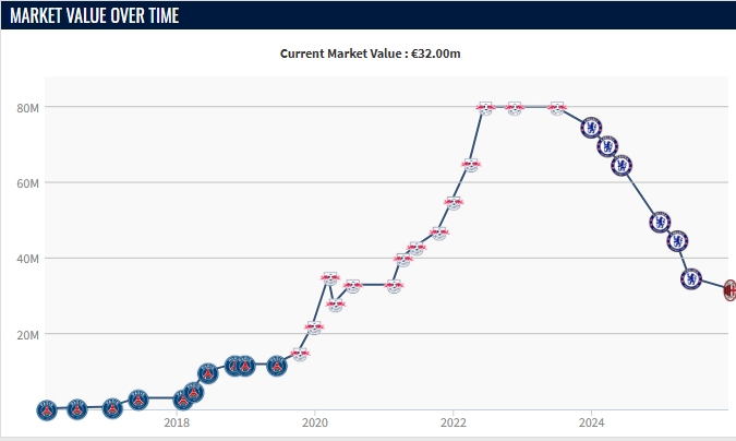 两年前恩昆库还在莱比锡效力时,他的身价最高曾达到8000万欧,但自从加盟切尔西后,身价就一路下滑。