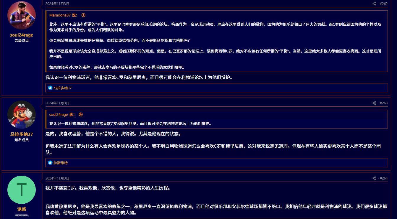 巴萨论坛这么尊敬西罗了?这里是巴萨论坛,Messi理应在这里受到敬仰。但我不明白利物浦球迷怎么会喜欢C罗?你不会指望曼联球迷维护萨拉赫,德布劳内。现在有些人确实更喜欢某个人而不是某个团队。死忠和普通球迷的区别kkkk