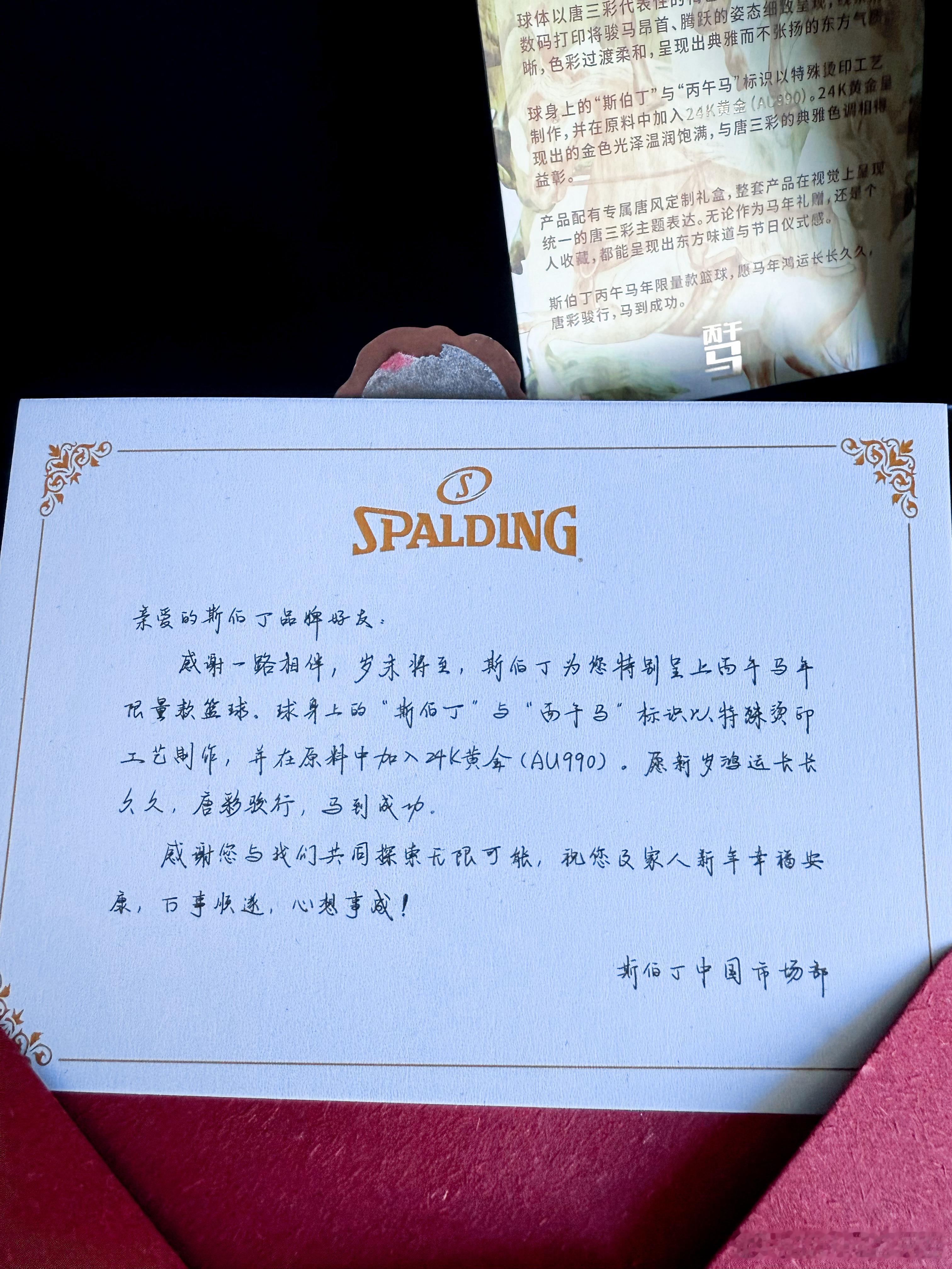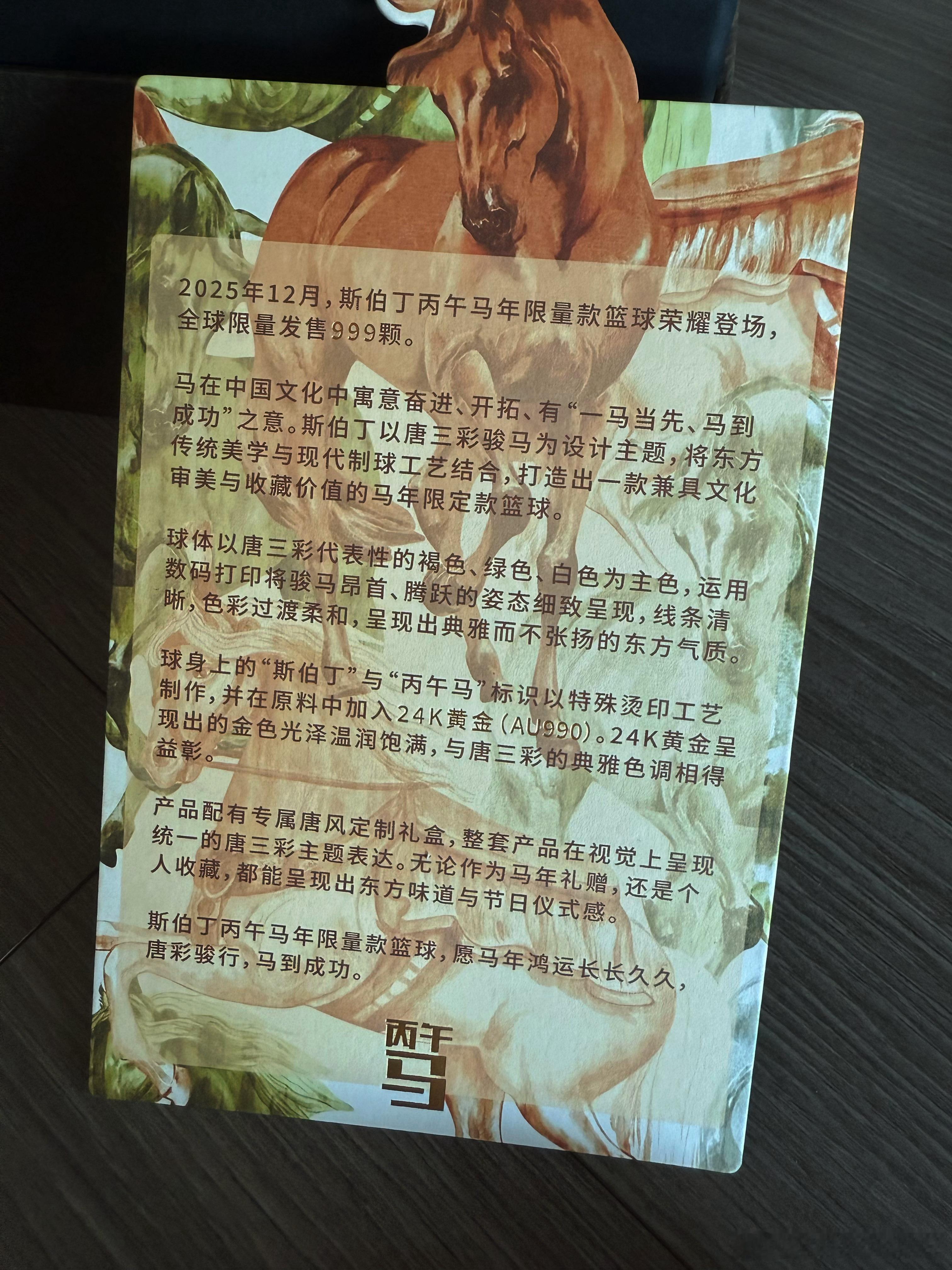 斯伯丁丙午马年限量款篮球,全球限量发售999颗。实物确实很有质感。以唐三彩骏马为