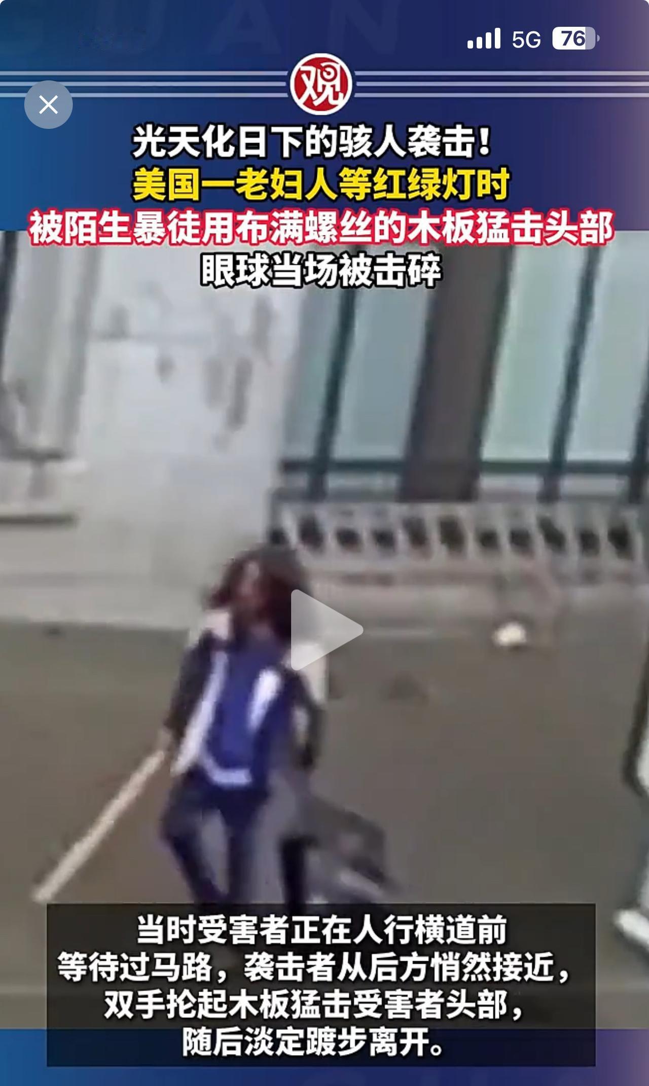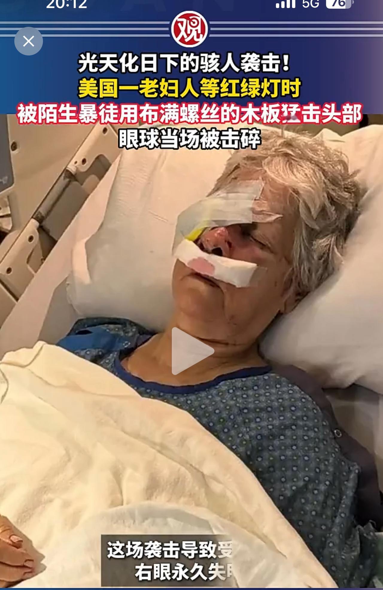 米国一蒙面男子光天化日之下,用木板袭击等红绿灯的老妇人,导致老人右眼当场失明!看
