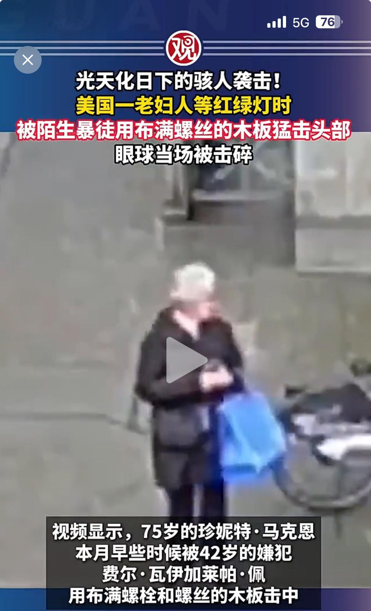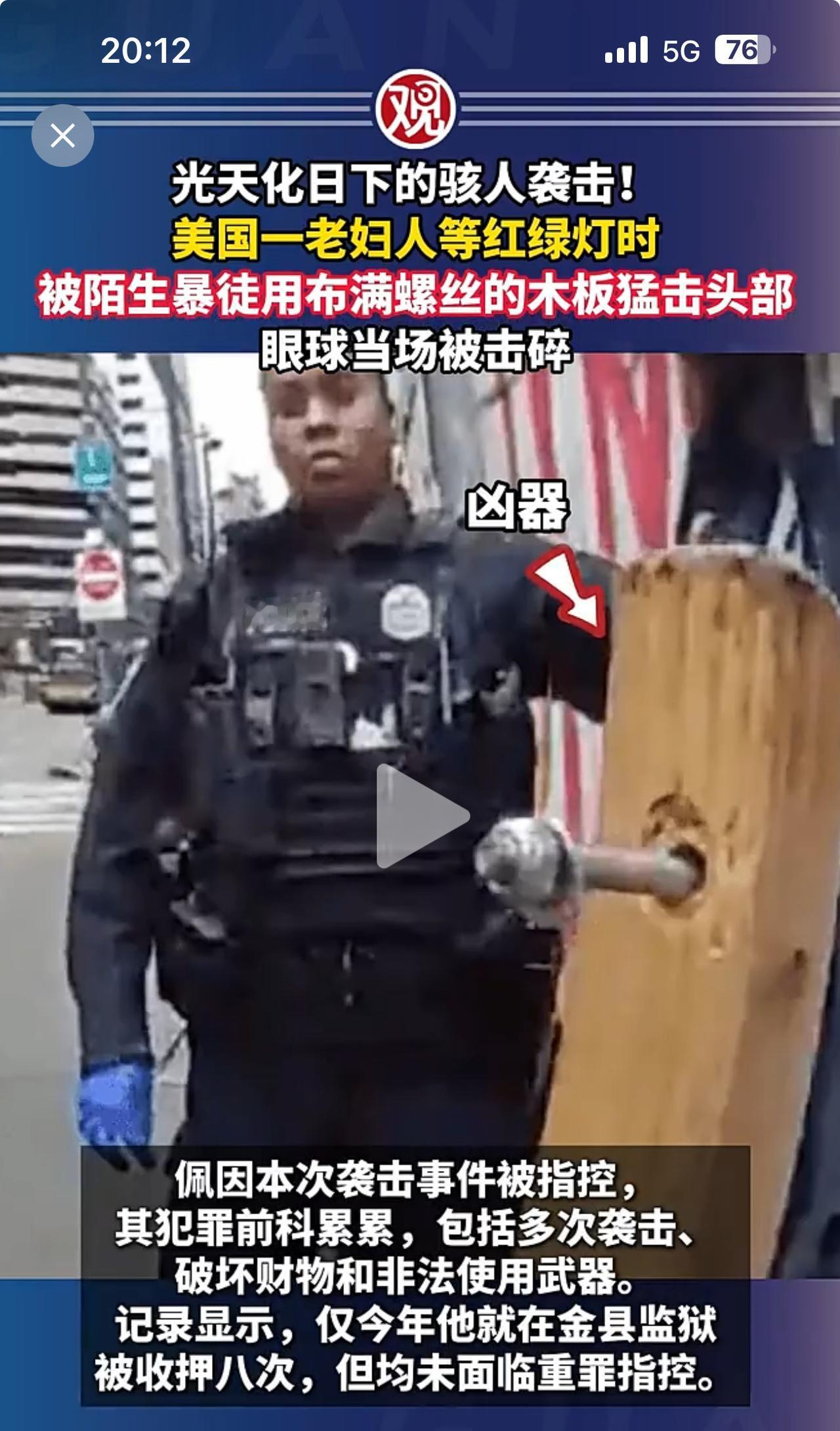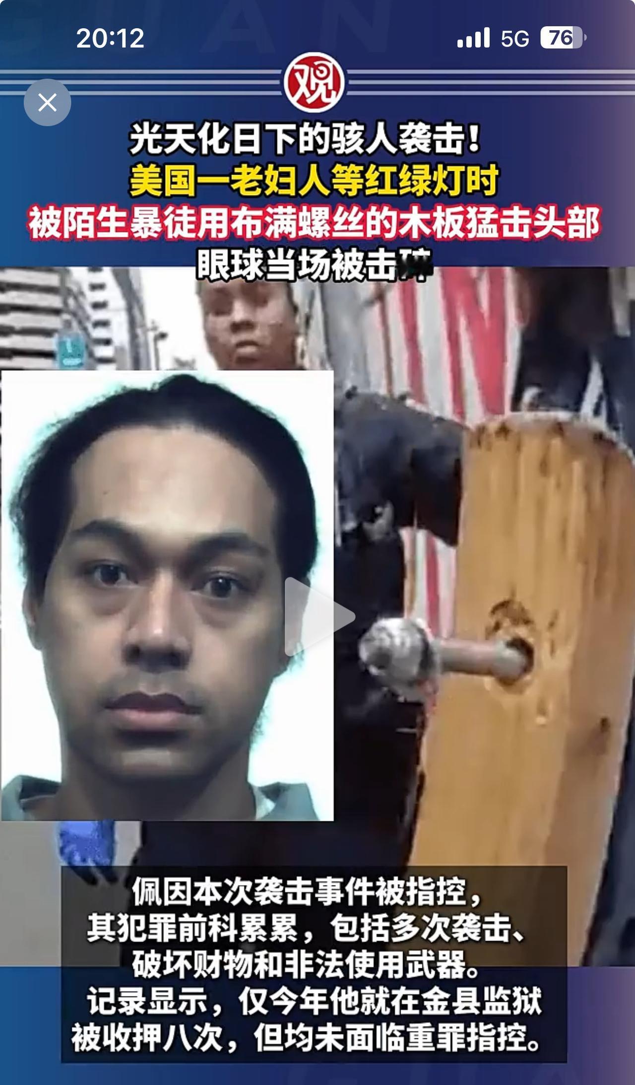 米国一蒙面男子光天化日之下,用木板袭击等红绿灯的老妇人,导致老人右眼当场失明!看监控视频,场面相当骇然! 据警方介绍,此人具有多次犯罪前科,仅今年被捕记录就高达8次,但是依然能够游走在社会成为危险分子,最终导致这起悲剧发生。 这让我想起了乌克兰女孩伊莲娜在美国地铁的悲惨遭遇,被路人莫名其妙袭击割喉!事后警方查明,凶手也是有多次被捕记录,但是从未被治罪! 没想到,美国的一些地方司法机关腐败烂到如此程度!太令人意外了。