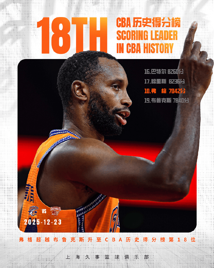 赛中,据上海男篮官方消息,在今晚对阵浙江稠州金租的比赛中,随着弗格在第三节命中一记三分,他的CBA生涯总得分来到7842分,超越马尚-布鲁克斯升至CBA历史得分榜第18位!