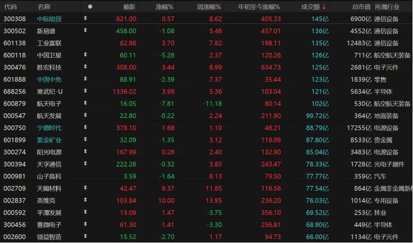 主要指数虽多数收红,但个股跌多涨少:3856只收跌,跌停股15只;1512只收涨,涨停股68只。8只个股日成交额超过100亿元,工业富联、胜宏科技、寒武纪-U涨幅均超过3%;中际旭创收涨0.57%报621元/股,新易盛收跌1.08%报458元/股,中国卫星跌逾5%,中国中免跌逾2%,航天电子收跌7.81%报16.05元/股。
