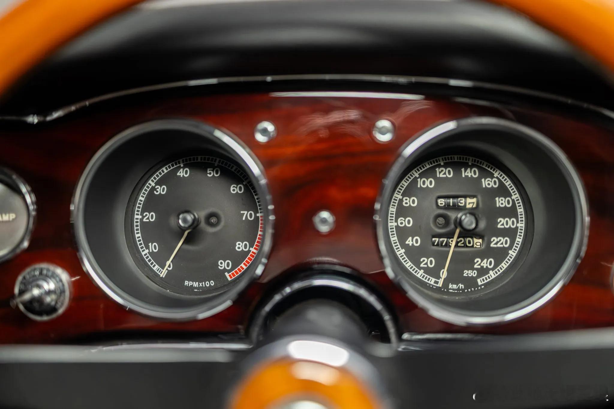 大V聊车 这是一辆1967年的丰田2000GT,这款车在1965年的东京车展上首次亮相,然后于1967年2月投产,在3年的制造周期内仅生产了351辆。丰田2000GT是丰田与雅马哈联手开发的,发动机由雅马哈的Itawa工厂手工制造,车身是丰田的Satoru Nozaki设计,能看到车身轮廓借鉴了捷豹E-Type和保时捷911等欧洲跑车的造型。外形上丰田2000GT还是有些自己的特点,车身高度只有116厘米,车头配备有弹出式前照灯及安装在前杠的共4只头灯。侧面视角长车头呈现子弹头造型,安装有翼子板后视镜还设置了发动机侧散热孔。丰田2000GT动力是代号3M的排量1988毫升双顶置凸轮轴直列6缸发动机,配备3组Mikuni Solex化油器,最大功率150马力,匹配5挡手动变速箱,后轮驱动,0-100公里/小时加速时间9秒内,最高车速217公里/小时。车内最引人注目的是中控台上部的一组监测机油油压、油温,冷却液温度、燃油液位和电压的小口径仪表,中控台下部甚至还配备了一个Jeco的圈速计时器,旁边设有停止与启动和重置按钮。丰田2000GT最初的售价为7150美元,比同时期的E-Type还要贵。如今,因其极少的产量在收藏市场起步就要80多万美元,个别甚至超过了100万美元。有记载在2022年最高的成交纪录以253万美元价格售出。