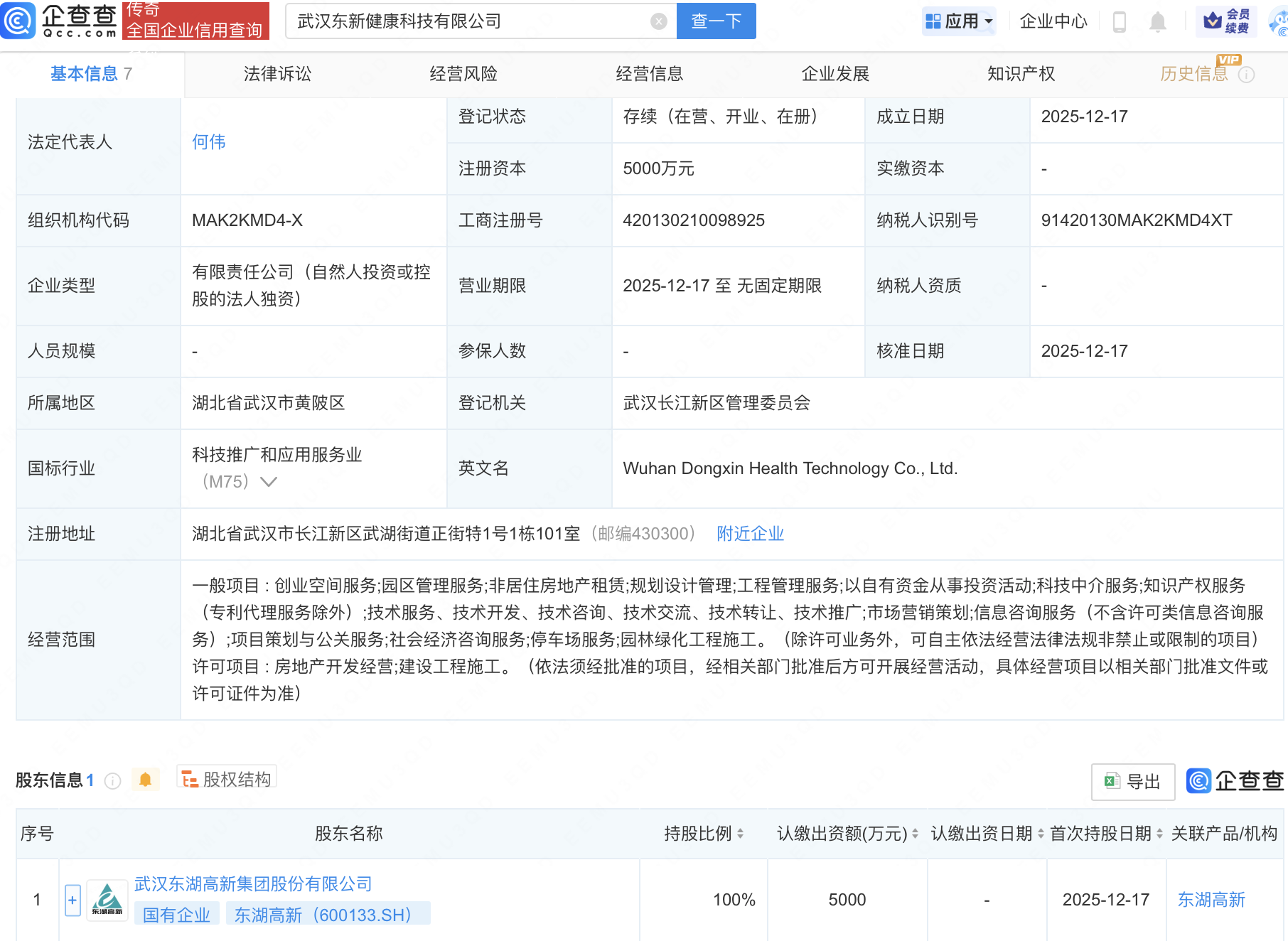 企查查APP显示,近日,武汉东新健康科技有限公司成立,经营范围包含:创业空间服务;园区管理服务;非居住房地产租赁;规划设计管理等。企查查股权穿透显示,该公司由东湖高新(600133)全资持股。