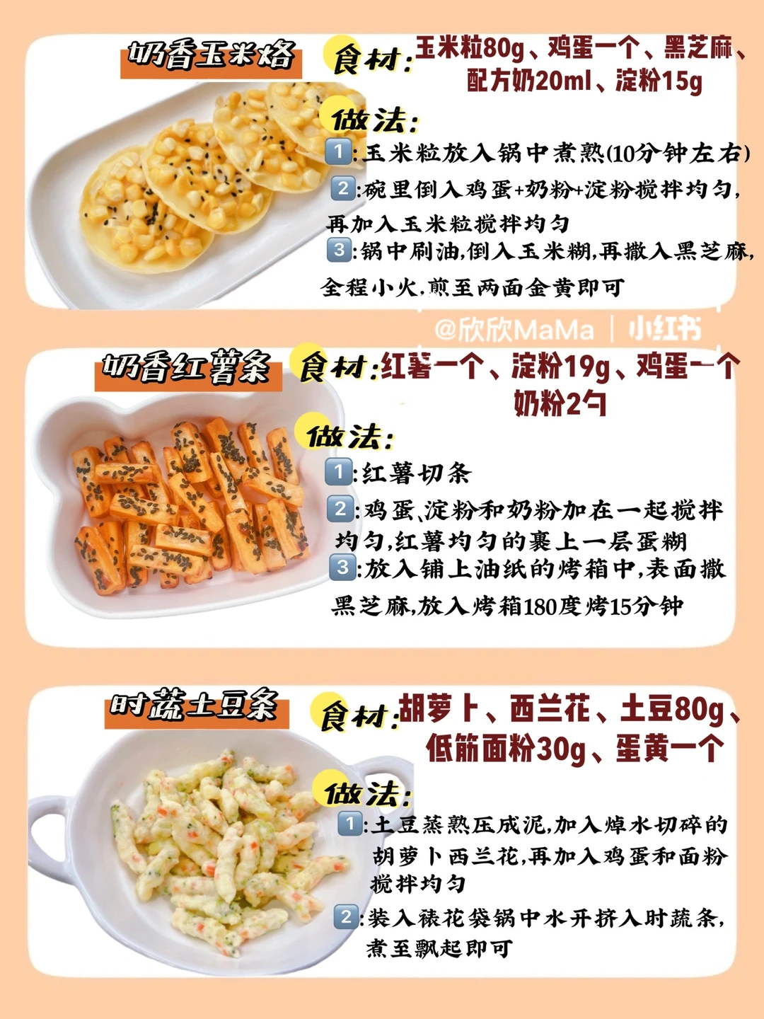 ⚠️随着宝宝的月龄增长,要逐渐的改变食物的形状,7-9个月是宝宝咀嚼能力黄金期,宝妈们一定不要错过哦,手指食物可以锻炼宝宝的精细动作,提升咀嚼能力,增强自主进食意识。