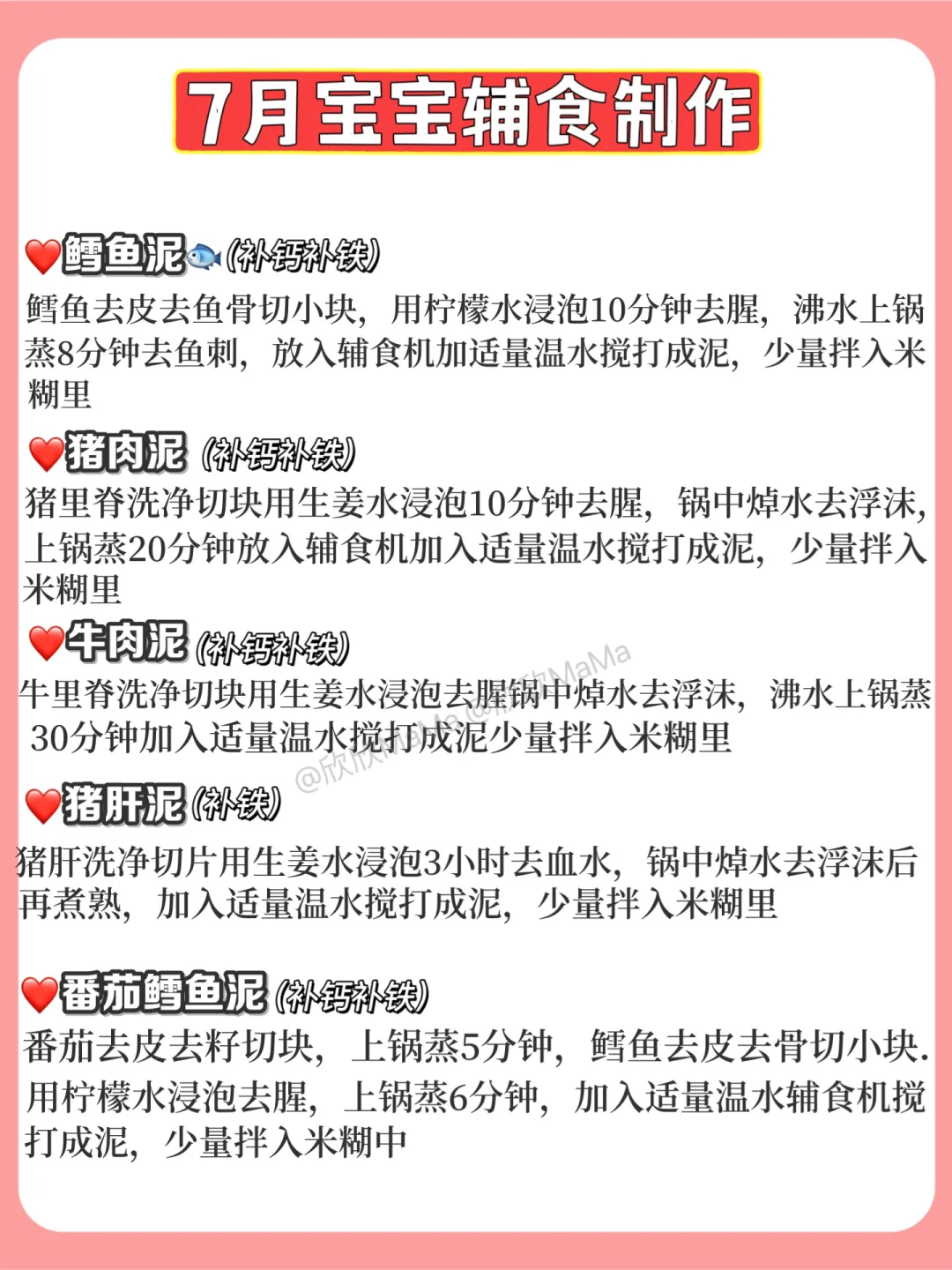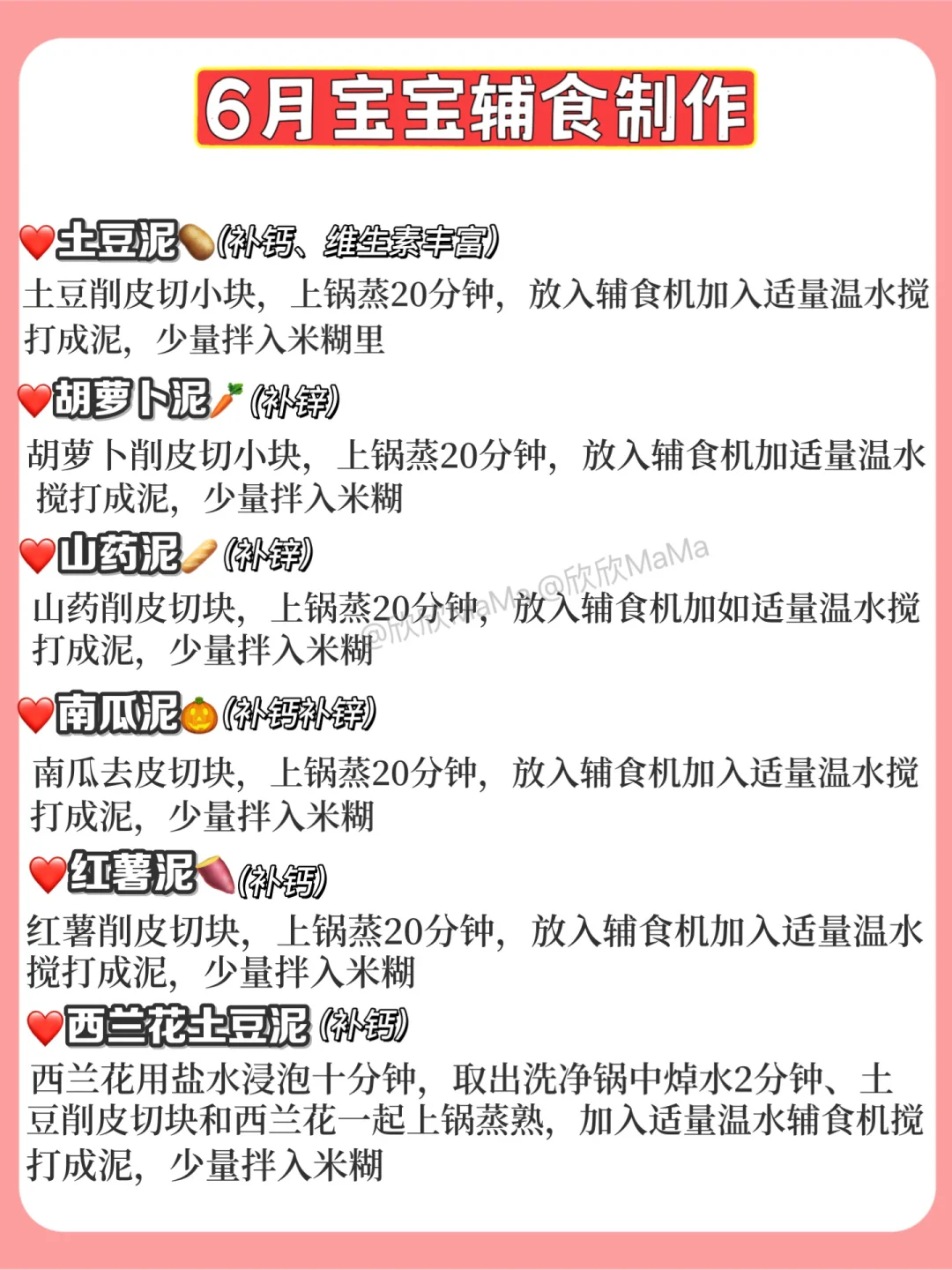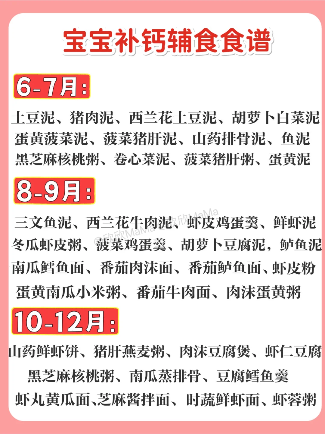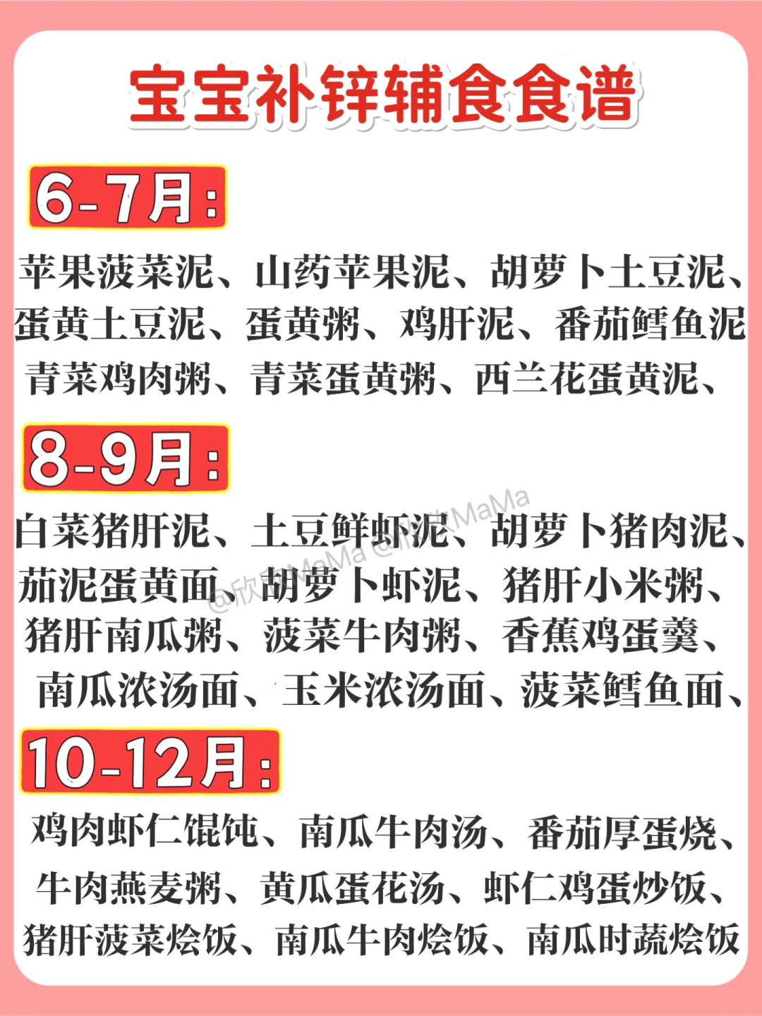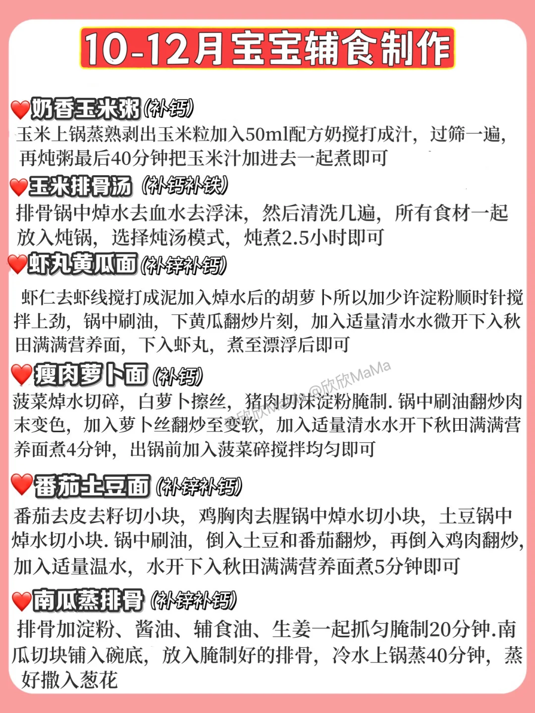 6个月宝宝就可以添加辅食了,很多麻麻都担心宝宝缺钙缺铁等维生素,今天整理了保姆级的宝宝补钙补锌补铁食谱大全,只要在辅食中给宝宝补充各种营养,食物搭配得当,就能起到1+1>2的效果哦! 🔻米粉冲泡方法 宝宝第一口辅食应该选择高铁米粉 米粉冲泡步骤: 先倒50度温水到碗中,加入适量米粉, 静待30秒,用勺子顺时针搅拌均匀 . 🔻添加辅食顺序 宝宝添加高铁米粉一周后,就可以在辅食里添加蔬菜泥拉.刚开始从根茎泥开始,慢慢过渡到蔬菜泥,肉泥,7月后半月就可以尝试米粥和面条了了! . ⚠️ 每添加一种食材3天排敏期,如辅食泥第一天1-2勺,第2天2-3勺逐渐增加拌入米粉里,水果泥单独吃! . 🧡我用的是秋田满满营养面条,我最喜欢它的原因是不管小月龄宝宝还是大月龄宝宝都可以放心的吃!面条长短可以根据的宝宝咀嚼能力来调整。它配料表干净、无盐,它家严格按照婴幼儿标准执行,而且面条里有多种营养元素每一口都是满满的营养,煮出来也不容易坨,宝宝也容易咀嚼,一小袋独立包装,一次一袋刚刚好!有很多口味选择,我们家都尝试过,每款都不会踩雷! 🔻宝宝补钙食谱 ▫️6-7月龄:土豆泥、猪肉泥、西兰花土豆泥、胡萝卜白菜泥等 ▫️8-9月龄:三文鱼泥、西兰花牛肉泥、鲜虾泥、番茄牛肉面、番茄鲈鱼面、番茄鸡蛋面 ▫️10-12月龄:肉沫豆腐煲、南瓜蒸排骨、豆腐鳕鱼羹、时蔬鲜虾面 🌟具体做法请看👀图 . 🔻宝宝补铁食谱: ▫️6-7月龄:猪肝泥、红枣泥、牛肉泥、樱桃泥等 ▫️8-9月龄:土豆猪肝泥、西兰花牛肉泥、猪肝粉、菠菜蛋黄粥、菠菜鸡蛋面、番茄鳕鱼碎碎面 ▫️10-12月龄:白菜肉沫面、牛肉鸡蛋粥、猪肉荠菜馄饨 🌟具体做法请看👀图 . 🔻补锌食谱: ▫️6-7月龄:山药苹果泥、蛋黄土豆泥、蛋黄粥等 ▫️8-9月龄:白菜猪肝泥、土豆鲜虾泥、猪肝小米粥、南瓜浓汤面、玉米浓汤面 ▫️10-12月龄:鸡肉虾仁馄饨、南瓜牛肉汤等 🌟具体做法请看👀图 . 整理的资料希望对你们有用 有疑问🤔️也可以评论区留言喔😄 💡关注我带您解锁更多辅食制作
