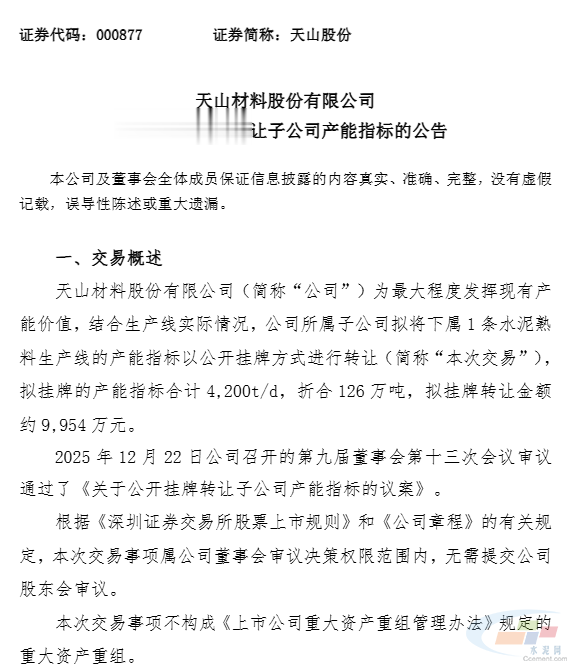 12月22日,天山材料发布公告,为最大程度发挥现有产能价值,结合生产线实际情况,公司所属子公司拟将下属(江西安福南方水泥有限公司)1条水泥熟料生产线的产能指标以公开挂牌方式进行转让,拟挂牌的产能指标合计4200t/d,折合126万吨,拟挂牌转让金额约9954万元(单价79元/吨)。