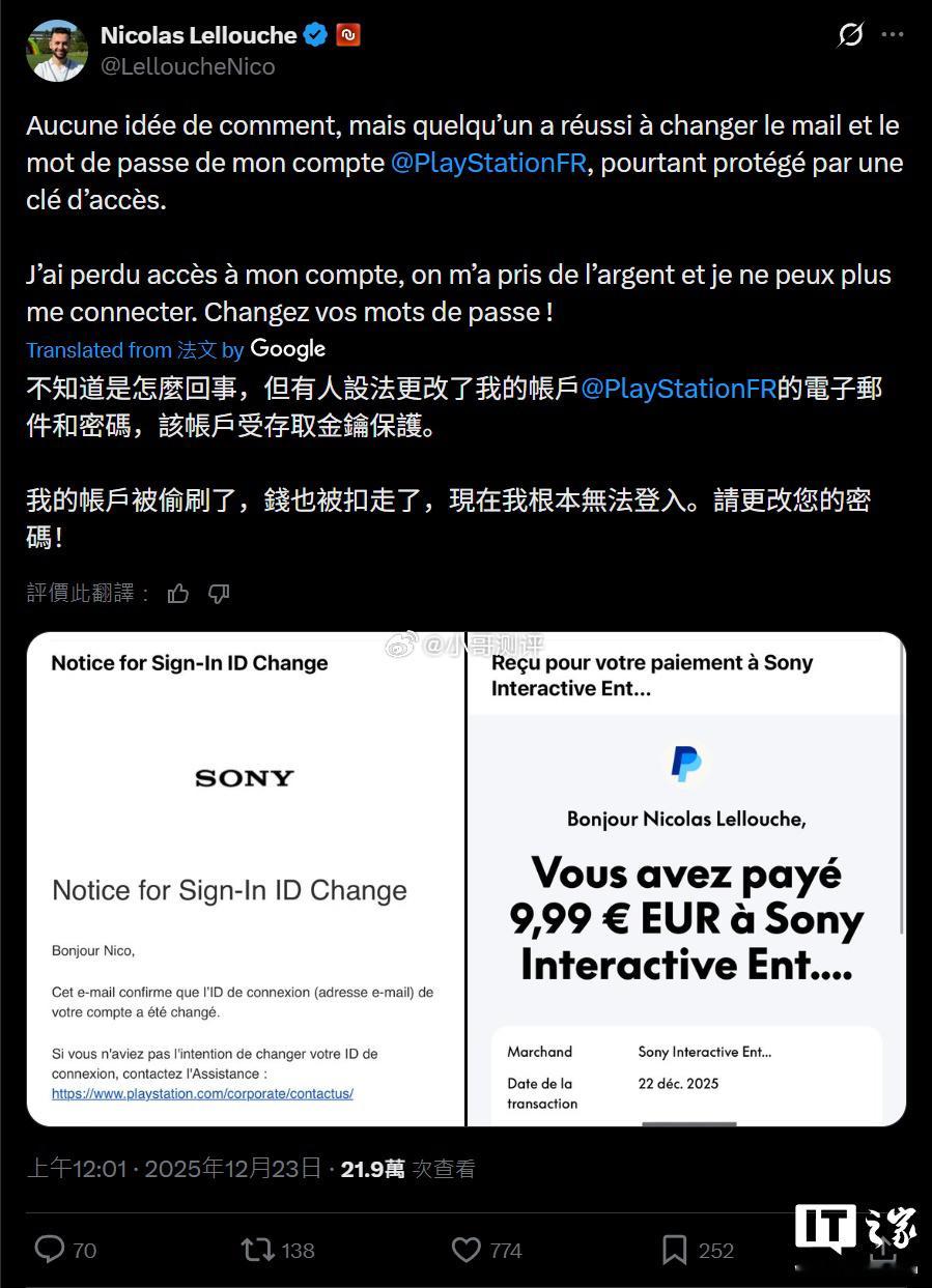 法国媒体 Numerama 记者 Nicolas Lellouche 昨天在 X 平台发文称,他的索尼 PlayStation Network 账号遭到了黑客入侵,即使他开启了通行密钥,平时只使用苹果 iPhone 的 FaceID 登录账号也无济于事。Nicolas Lellouche 表示,一名黑客通过非常手段盗取了他的 PSN 账号,成功更改了账号绑定的电子邮箱以及密码,甚至还使用了关联的 PayPal 账号进行了一笔 9.99 欧元(IT之家注:现汇率约合 82.7 元人民币)的盗刷消费。随后他发布博文,详细解释整件事情的经历,他最初打电话联系了索尼客服,等待 40 分钟后接通,对方的态度异常轻松,只花了 5 分钟就帮他找回了账号,随后他迅速重新设置了密码和通行密钥,并发现黑客删除了所有好友、聊天记录、头像等。这名记者发现黑客自称“Derol Bodden”,这个人有多个类似前缀的账号,这让他怀疑自己并非唯一受害者,并且黑客还在当天 18:04 重复了同样盗号流程,而且最绝望的是,这时候索尼客服下班了,美国那边的客服也拒绝提供协助。