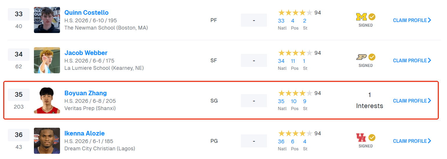 虎扑12月24日讯美国体育媒体ON3Sports发布了最新一期2026届高中生排名。其中,中国留洋球员张博源排名全美第35位,获评四星高中生,综合评分为94分。