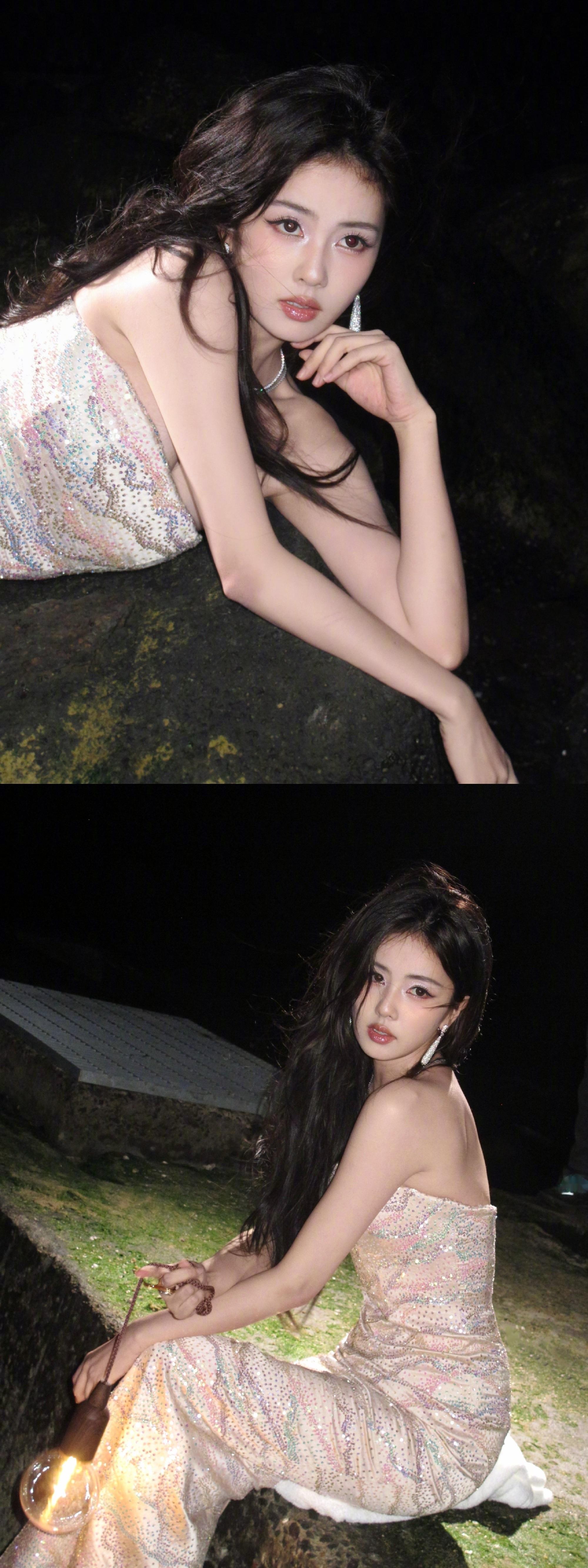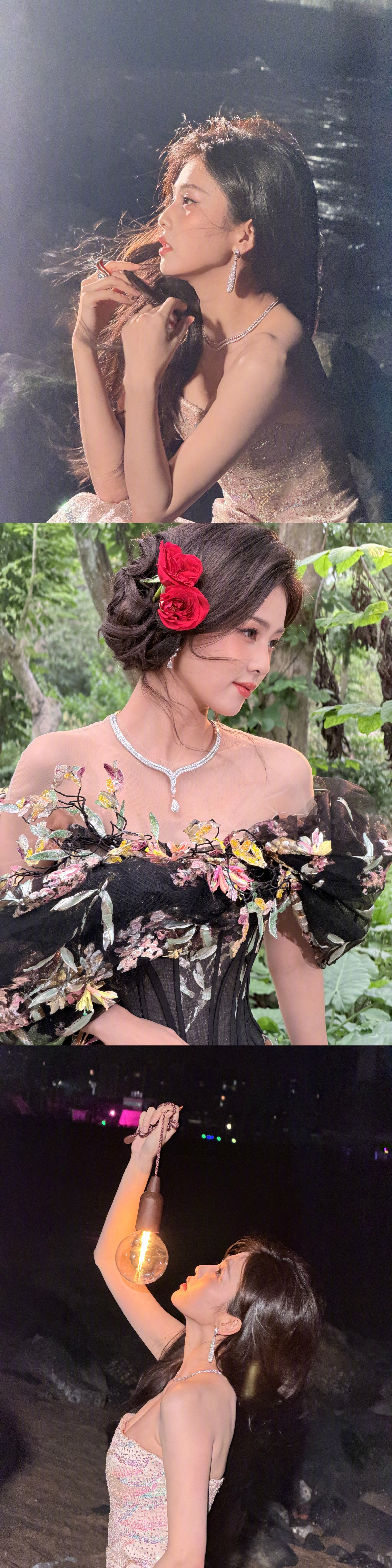 陈紫函身姿曼妙,一袭珠饰礼裙勾勒出玲珑曲线,在柔美白绒与镜面光影间,每一处线条
