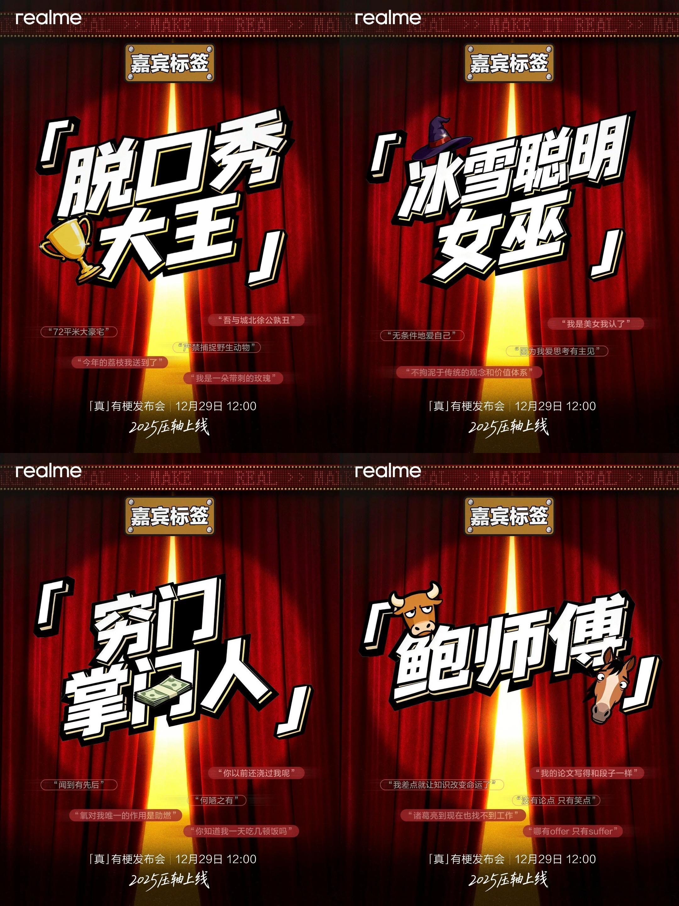 真我怎么整了个脱口秀发布会,叫「真」有梗发布会,不发产品发「技能」,嘉宾有何广智、王小利、小四爷、李文。
