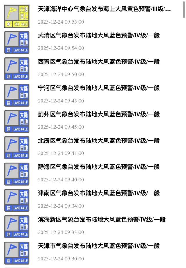 此外,武清区、西青区、宁河区、蓟州区、北辰区、静海区、津南区、滨海新区等多区也相继发布了陆地大风蓝色预警信号——