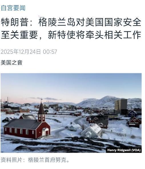 美国中文媒体今天(12月24日)报道:“特朗普:格陵兰岛对美国国家安全至关重要,
