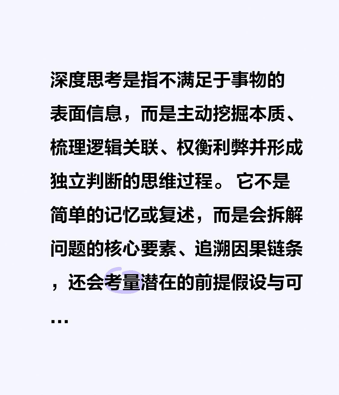 深度思考这事儿可太重要了。就拿买手机来说,很多人只看外观和品牌这些表面信息,看到好看的、大牌的就入手。但深度思考的人不一样,他们会拆解问题核心。比如研究处理器性能、电池续航能力这些关键要素,追溯因果链条,思考为什么这款处理器好,对使用体验有啥影响。还会考量潜在前提假设和局限性,像这款手机宣传的高像素拍照,是不是在特定条件下才成立。深度思考能让我们不被表象迷惑,做出更明智的选择,少花冤枉钱,多体验到事物的真正价值。