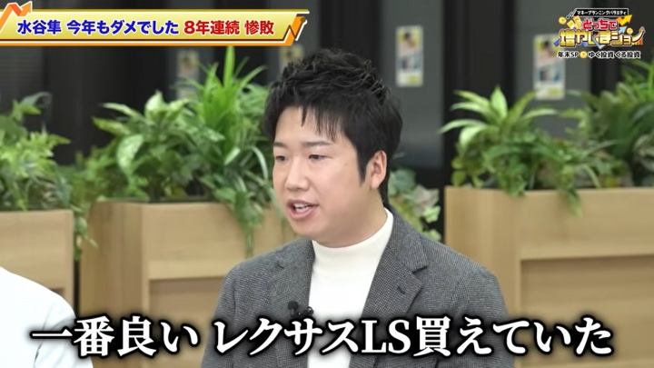 节目中提到,水谷隼2024年说“亏损足以在东京买一套房”,接着聊到“2025年的亏损够买什么?”,水谷隼感慨道:“上周我去看雷克萨斯,翻着宣传册突然想到,要是今年没投资的话,我完全能买下顶配的雷克萨斯LS。现在我的总亏损额大概相当于一套房子加一辆LS的价钱。”由此透露2025年亏损额已达到可购置豪华轿车雷克萨斯LS的程度。