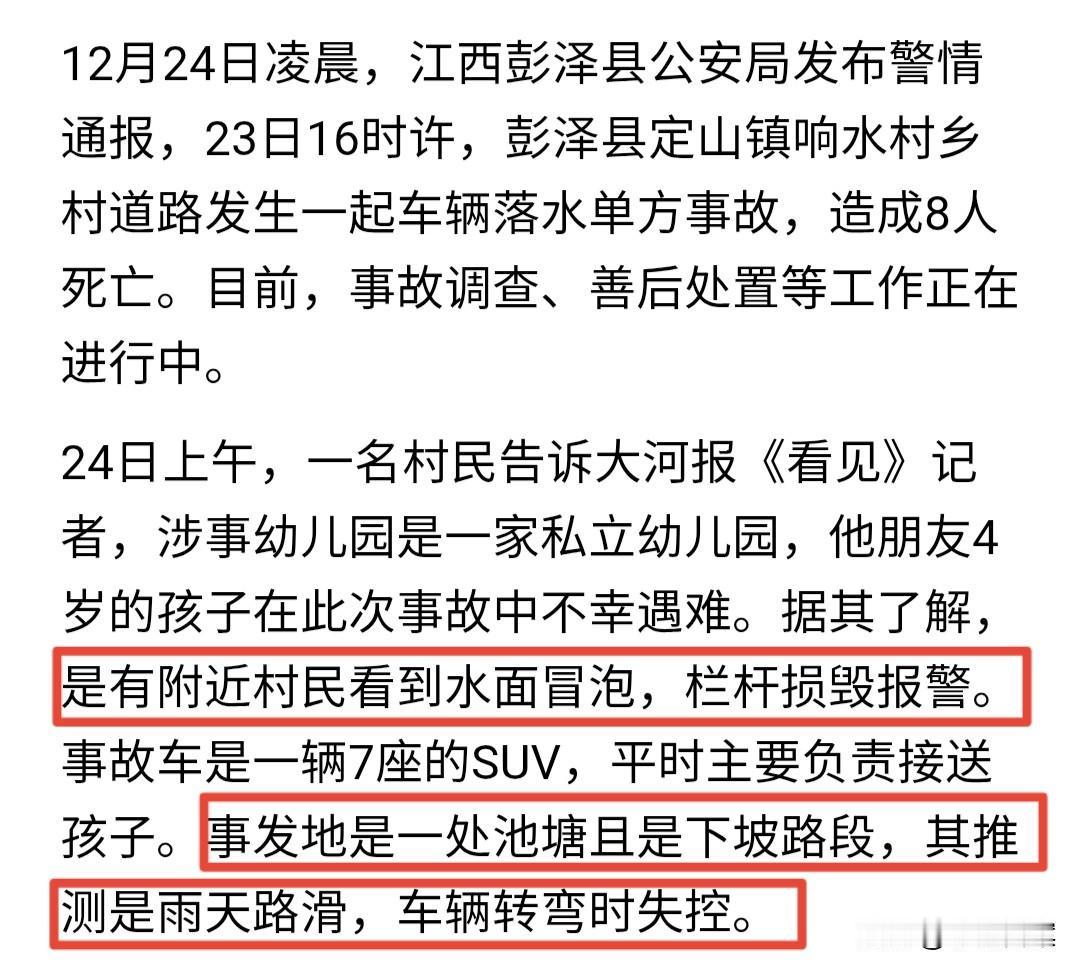 太痛心了!江西汽车坠塘8死事故,是49岁幼儿园女园长亲自开车送孩子回家,村民发现落水时已经晚了,这场事故原本可以避免。 事情就发生在昨天傍晚的江西彭泽定山镇,落水汽车是一辆7座SUV,从8人死亡的惨痛结果看,车辆本身显然是超载状态。 开车的是49岁幼儿园女园长,放学照常送孩子们回家,在一处下坡路段,车辆转弯失控坠塘。 附近村民看到栏杆损毁、水面冒泡,才知道是出了事故,慌忙报警。 这个细节值得注意!一般来说,车辆冲入水中,不会一下子坠底,而是会漂浮一会儿再缓慢沉入。村民只看到水面冒泡,却看不到车辆本身,说明时间至少过去了几分钟。 寒冷刺骨的冬天,车上又都是孩子,落水后坚持不了多久,哪怕救援再快,也是等不到的。 如果车辆落水瞬间,刚好有人目击,立刻报警并组织村民救援,伤亡结果应该会小很多。 定山镇这两天在下雨,空气阴冷、地面潮湿,有村民推测是雨天路滑导致的车辆失控。 开校车除了需要相应的驾驶证外,还需取得额外校车驾驶资格,其中一条就是3年以上驾驶经历,可以说是需要老司机。 下雨路滑、前方下坡、要转弯、有池塘,这些因素综合在一起,是告诉司机要提前减速、谨慎驾驶。若有做到,事故大概率便不会发生。 当然,村民的推测只是一家之言,具体原因还需等官方调查后才能确定,但无论何时,谨慎开车、规范行驶,都是没错的! 8条鲜活生命意外离世,背后的家庭也会因此破碎,新年将至、除夕不远,希望所有人都能够平平安安,与家人团聚…… 【来源:大河报】