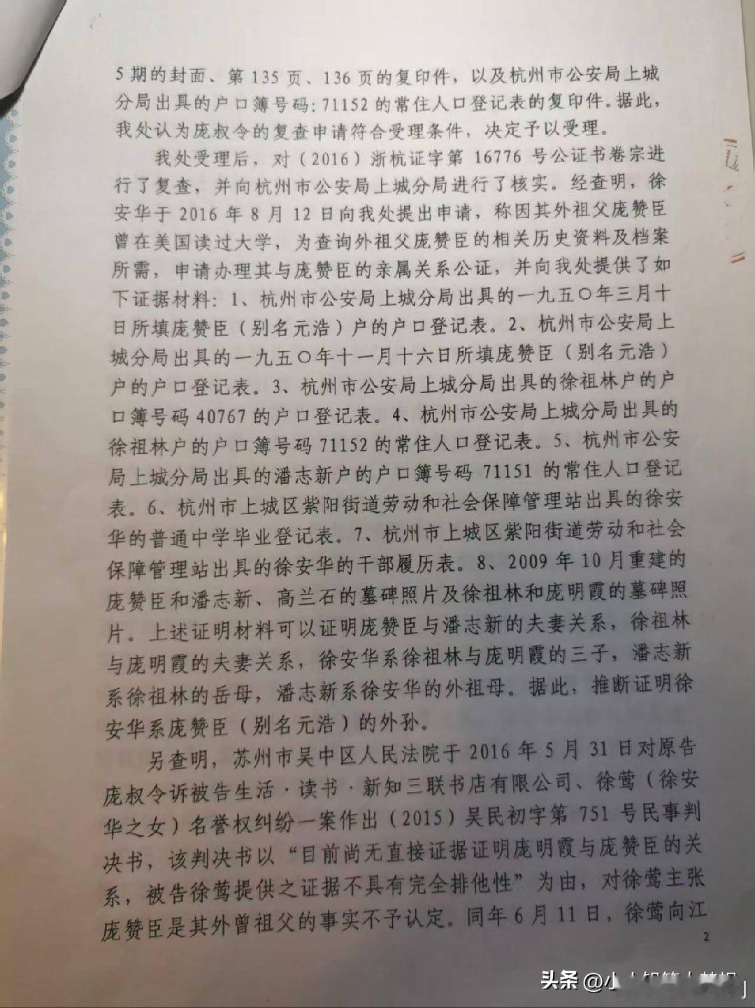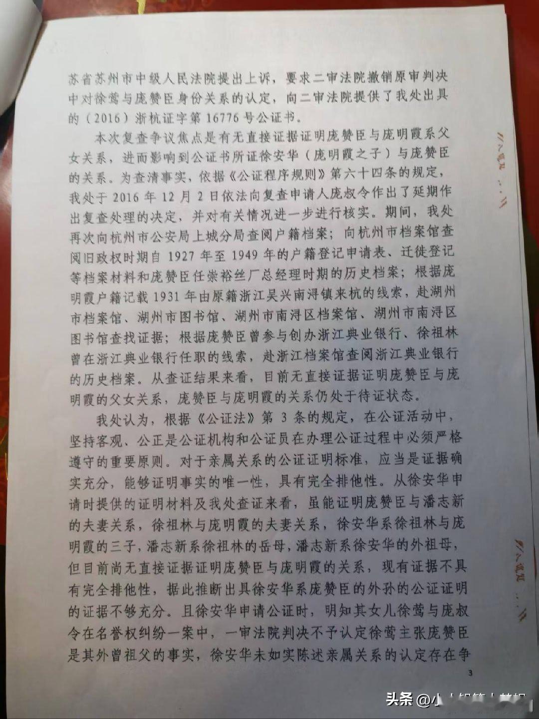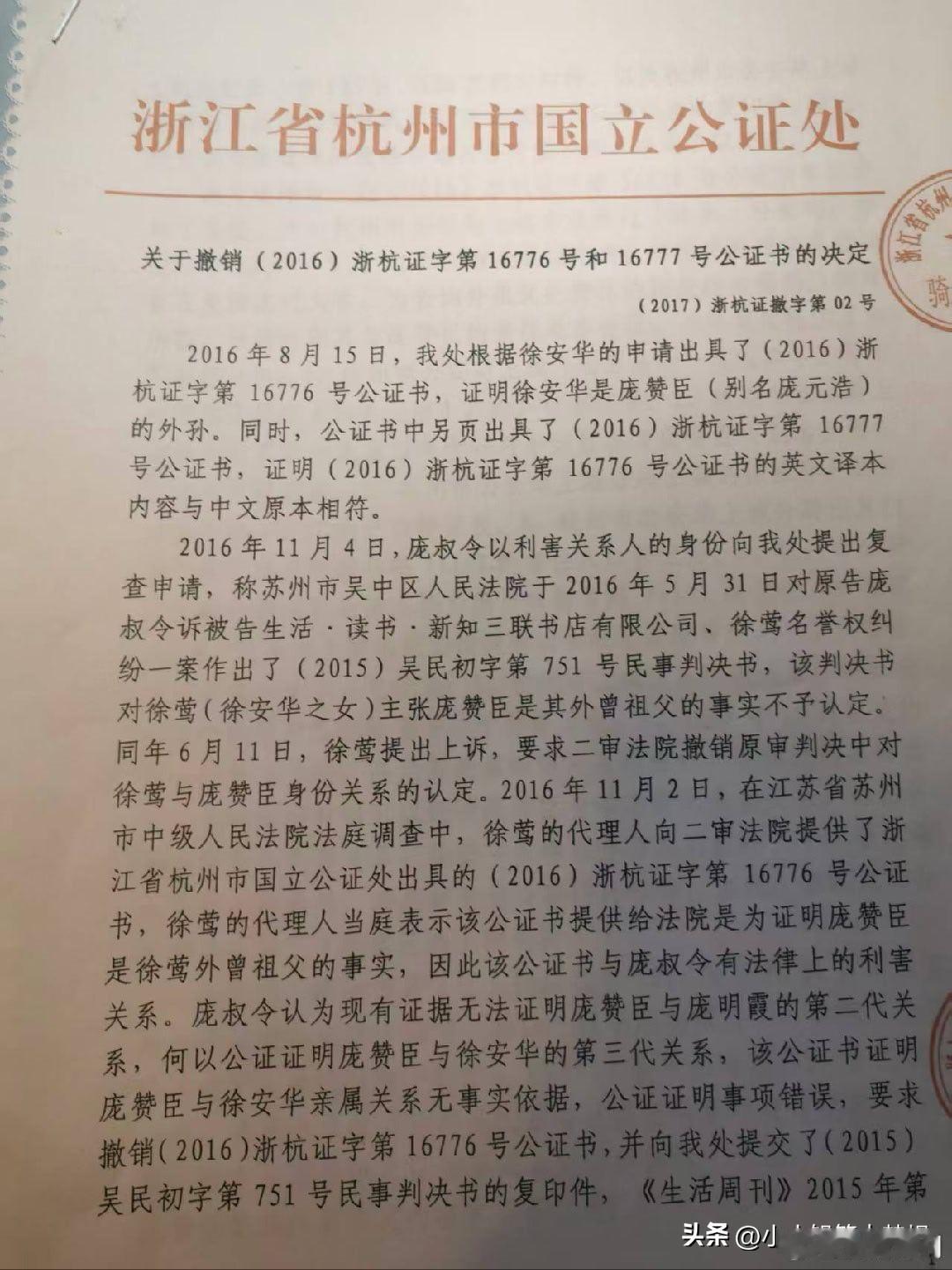 这个徐莺真的不要脸!国家文物局和江苏省政府已经开始调查南博事件,这场大戏才刚刚开始,关键的人物就是徐莺。 近日,庞叔令给亚洲周刊提供了一份17年撤销的是16年公证,谁知道网友揭露原来18年徐莺又让杭州的一家之江公证又给了一份公证…… 这个认证的脉络是这样子的,14年在庞家的作品展中,这个徐莺以庞莱臣的后人身份担任助理,并对外称自己就是庞赞臣的后人! 2015年,真正的庞莱臣后人庞叔令到访南博,她发现徐莺是假的,所以庞叔令以“侵犯庞家后人名誉权”起诉了她和南博。在法庭中交谈中发现这个女的根本不了解自己家族,言谈中漏洞百出,更甚连人家庞莱臣的老婆的名字都说不对,让她公开道歉,这个事情法院一审判徐莺和南博败诉。 先说一下这里的人物关系,庞赞臣别名庞元浩臣,他的妻子是翻志新,女儿庞明霞,庞明霞的丈夫是徐祖林,徐祖林的儿子是徐安华,徐安华的女儿就是徐莺。 徐莺就对外声称自己是庞赞臣的曾外孙女,庞赞臣就是庞莱臣的堂兄弟,庞赞臣是庞莱臣的遗嘱执行人,所以她就是庞家的后人。 徐莺不服啊,提起二次诉讼,提交了一份国立的公证。这份公证是2016年,徐莺父亲徐安华向杭州市国立公证处申请公证,目的就是想证明其为庞赞臣(庞莱臣堂弟)的外孙。 徐家当时提供了一个2009年新刻的墓碑的照片,墓碑上有两个女人的名字,一个应该是原配,墓碑上写徐莺的爷爷管庞赞臣的老婆叫岳母,因此推定徐莺是庞赞臣曾外孙女。 但庞书令对这件事情很较真,特地去查了一下杭州公安局的户籍档案,在1950年的户籍登记中显示庞赞臣子,女,皆亡。 当时法院找到了这个杭州国立公证处去询问情况,杭州国立公证处非常委屈称徐莺的父亲说开这个证明是让徐莺去美国查庞赞臣的相关学习资料和档案,所以才申请办理庞赞臣与他的关系办的公证,不是说用来打官司的,所以他们就办理了,没想到他们拿着这个公证去打官司了。 这事儿不是说公证处说的是就是的,要经过法院严格审查的。经过法院审查之后,能证明庞赞臣和潘志新是夫妻关系,徐祖林和庞明霞也是夫妻关系,而徐安华也是徐祖林和庞明霞的三儿子,所以判断潘志新是徐祖林的岳母,潘志新是徐安华的外祖母,但没有证据证明庞赞臣和庞明霞是真正的父女关系! 后来,庞叔令还提供了庞氏的族谱和1949年庞莱臣的遗嘱原件,庞赞臣和庞莱臣根本就没有血缘关系!根本就是不是所谓的遗产执行人。 说白了人家庞莱臣根本就没有这样的堂弟,这个庞赞臣也没有资格分遗产,这关系扯的,从根源上就是错的! 所以国立公证处在2017年撤销了2016年开具的认定关系的公证,法院判南博和徐莺败诉! 后续是2018年徐莺又换了一个公证处,杭州之江公证处,按照2016年让杭州国立公证处开具认证书的方式又给她开具了一份,认定徐莺为庞赞臣外曾孙女的认证书! 这一份公证,是徐莺当时发在小红书,然后被人某举报了。 这件事让我觉得细思极恐,这个徐莺凭什么这么做啊?一个学生物的居然在国家级博物馆的包装下变成了收藏世家后人共同策展,身份造假,败诉之后更能逆袭为美院博士,我不得不怀疑这是一条精密运作的,学术权益的食物链。 从生物研究病毒的,变成了收藏学,跨界不是一般的大,太魔幻了,本科和硕士都是杭州师范大学生物专业,她的硕士论文还是在讨论剑兰花病毒和齿兰环斑病毒,然后被包装为策展人和庞家的后人,她顺利就进入了中国美院美术史系读博了,课题是20世纪的书画收藏而且还是专门研究庞莱臣的,被庞苏令识破之后,打官司败诉,至今还成为杭州师范大学音乐学院的人文学科副教授。 这事情细思极恐,当时徐湖平作为副院长,为她站台,为她的身份背书,当庞家人质疑文物的去向之后,出来了这么一个后人,是身份嫁接啊,让大家觉得庞家后人自己内斗了,让公众以为他们内部分赃不均。 这件事情告上法庭之后,最搞笑的是徐莺还让庞叔令证明自己才是庞家后人,这是反咬一口。 生物系突然转到跨界到美术收藏,而且还是委培生身份,说明可能是南博或者是中国美学院有人为其开了后门。 这事情到头来赢家还是她,造假身份零成本,到头来毫发无损,还收益了博士,副教授和学术地位,简介上的介绍无疑就是一个美术领域和收藏领域专家! 呦呵,这个玩的有点高端,活脱脱又一个董小姐啊!现在上面已经成立专班调查小组对南博进行调查了,这说明这个事情已经不是旁加了几幅画的问题了,是民族资产和国家级资产外流的问题了。 那徐莺应该是跟南博应该是有密不可分的关系啊,到底是谁给她铺的这条路?静待这次国家级调查的结果。