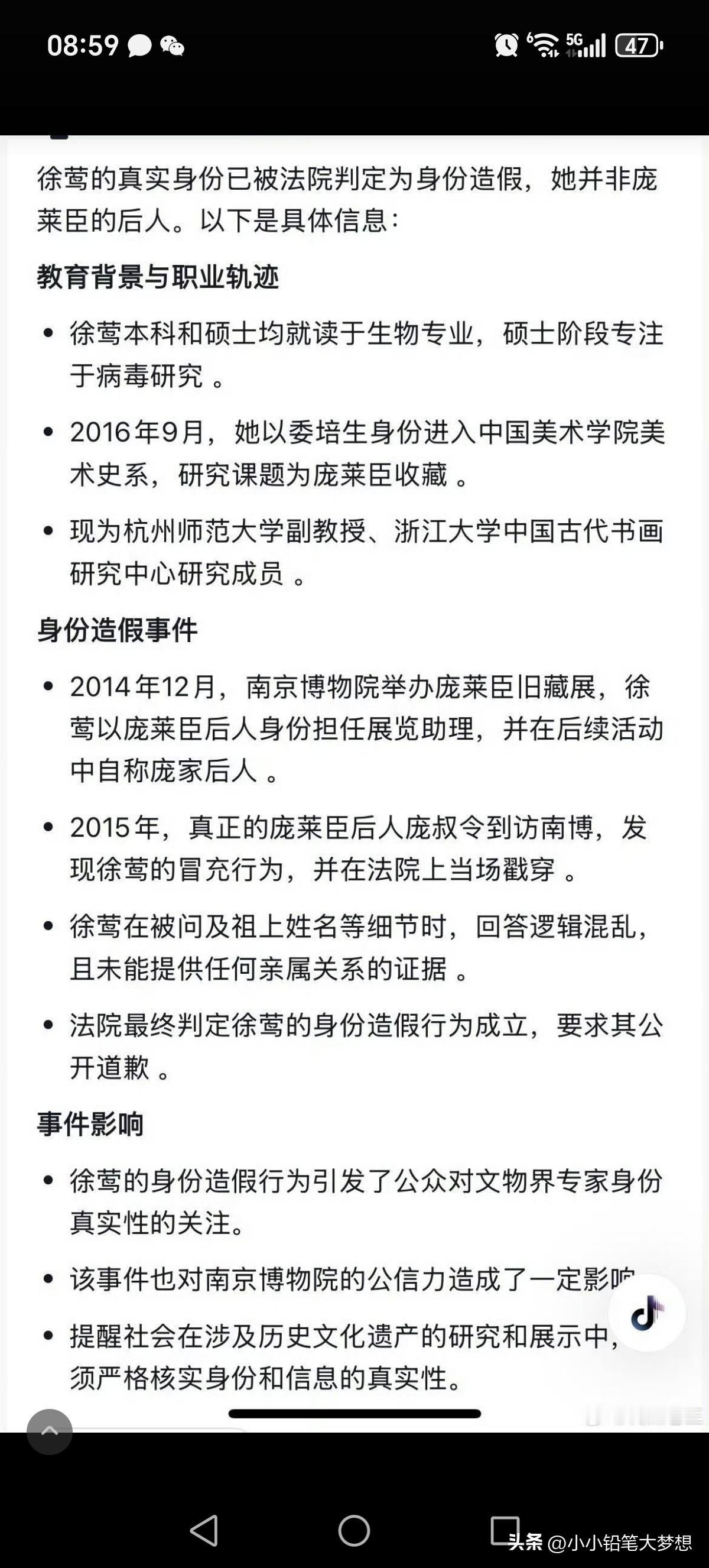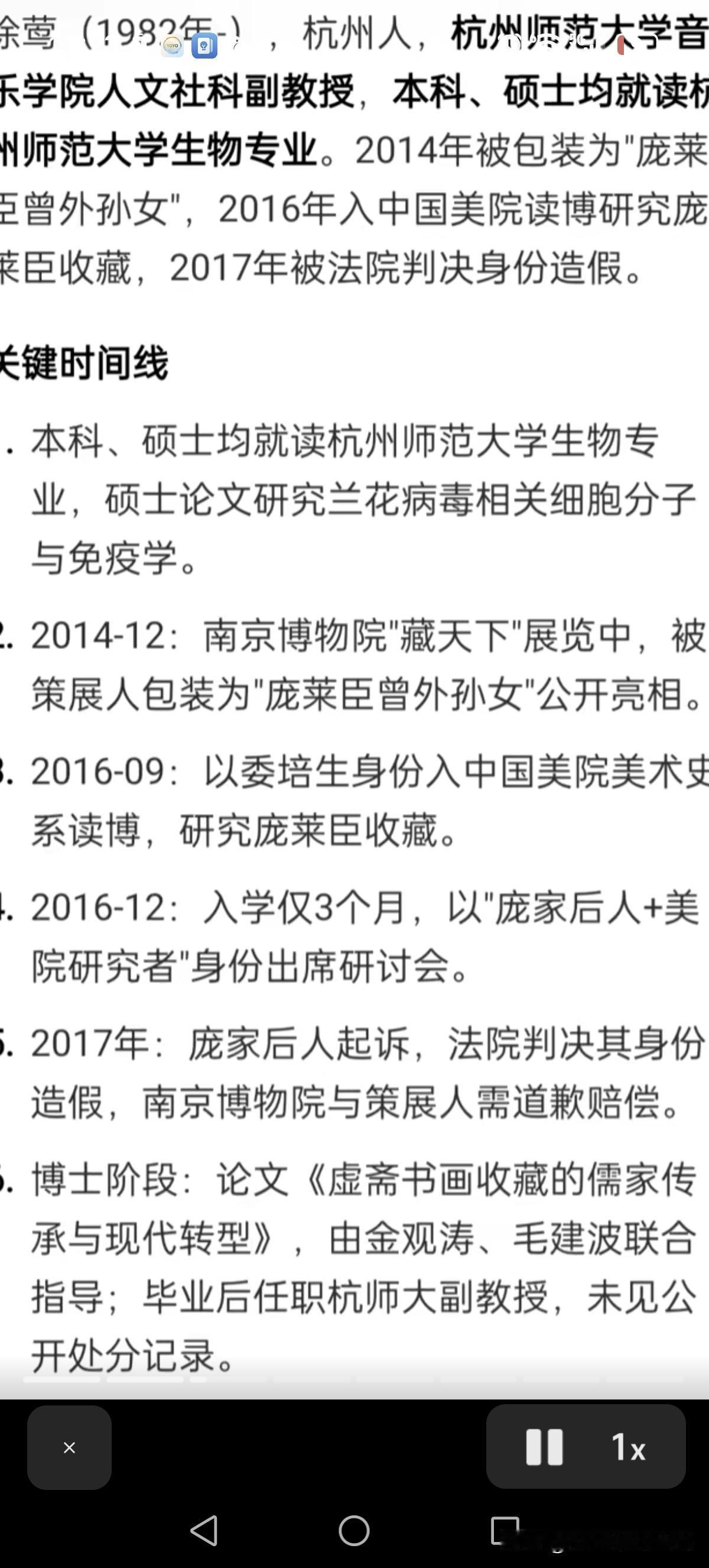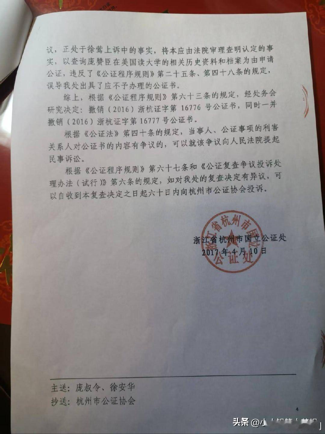 这个徐莺真的不要脸!国家文物局和江苏省政府已经开始调查南博事件,这场大戏才刚刚开始,关键的人物就是徐莺。 近日,庞叔令给亚洲周刊提供了一份17年撤销的是16年公证,谁知道网友揭露原来18年徐莺又让杭州的一家之江公证又给了一份公证…… 这个认证的脉络是这样子的,14年在庞家的作品展中,这个徐莺以庞莱臣的后人身份担任助理,并对外称自己就是庞赞臣的后人! 2015年,真正的庞莱臣后人庞叔令到访南博,她发现徐莺是假的,所以庞叔令以“侵犯庞家后人名誉权”起诉了她和南博。在法庭中交谈中发现这个女的根本不了解自己家族,言谈中漏洞百出,更甚连人家庞莱臣的老婆的名字都说不对,让她公开道歉,这个事情法院一审判徐莺和南博败诉。 先说一下这里的人物关系,庞赞臣别名庞元浩臣,他的妻子是翻志新,女儿庞明霞,庞明霞的丈夫是徐祖林,徐祖林的儿子是徐安华,徐安华的女儿就是徐莺。 徐莺就对外声称自己是庞赞臣的曾外孙女,庞赞臣就是庞莱臣的堂兄弟,庞赞臣是庞莱臣的遗嘱执行人,所以她就是庞家的后人。 徐莺不服啊,提起二次诉讼,提交了一份国立的公证。这份公证是2016年,徐莺父亲徐安华向杭州市国立公证处申请公证,目的就是想证明其为庞赞臣(庞莱臣堂弟)的外孙。 徐家当时提供了一个2009年新刻的墓碑的照片,墓碑上有两个女人的名字,一个应该是原配,墓碑上写徐莺的爷爷管庞赞臣的老婆叫岳母,因此推定徐莺是庞赞臣曾外孙女。 但庞书令对这件事情很较真,特地去查了一下杭州公安局的户籍档案,在1950年的户籍登记中显示庞赞臣子,女,皆亡。 当时法院找到了这个杭州国立公证处去询问情况,杭州国立公证处非常委屈称徐莺的父亲说开这个证明是让徐莺去美国查庞赞臣的相关学习资料和档案,所以才申请办理庞赞臣与他的关系办的公证,不是说用来打官司的,所以他们就办理了,没想到他们拿着这个公证去打官司了。 这事儿不是说公证处说的是就是的,要经过法院严格审查的。经过法院审查之后,能证明庞赞臣和潘志新是夫妻关系,徐祖林和庞明霞也是夫妻关系,而徐安华也是徐祖林和庞明霞的三儿子,所以判断潘志新是徐祖林的岳母,潘志新是徐安华的外祖母,但没有证据证明庞赞臣和庞明霞是真正的父女关系! 后来,庞叔令还提供了庞氏的族谱和1949年庞莱臣的遗嘱原件,庞赞臣和庞莱臣根本就没有血缘关系!根本就是不是所谓的遗产执行人。 说白了人家庞莱臣根本就没有这样的堂弟,这个庞赞臣也没有资格分遗产,这关系扯的,从根源上就是错的! 所以国立公证处在2017年撤销了2016年开具的认定关系的公证,法院判南博和徐莺败诉! 后续是2018年徐莺又换了一个公证处,杭州之江公证处,按照2016年让杭州国立公证处开具认证书的方式又给她开具了一份,认定徐莺为庞赞臣外曾孙女的认证书! 这一份公证,是徐莺当时发在小红书,然后被人某举报了。 这件事让我觉得细思极恐,这个徐莺凭什么这么做啊?一个学生物的居然在国家级博物馆的包装下变成了收藏世家后人共同策展,身份造假,败诉之后更能逆袭为美院博士,我不得不怀疑这是一条精密运作的,学术权益的食物链。 从生物研究病毒的,变成了收藏学,跨界不是一般的大,太魔幻了,本科和硕士都是杭州师范大学生物专业,她的硕士论文还是在讨论剑兰花病毒和齿兰环斑病毒,然后被包装为策展人和庞家的后人,她顺利就进入了中国美院美术史系读博了,课题是20世纪的书画收藏而且还是专门研究庞莱臣的,被庞苏令识破之后,打官司败诉,至今还成为杭州师范大学音乐学院的人文学科副教授。 这事情细思极恐,当时徐湖平作为副院长,为她站台,为她的身份背书,当庞家人质疑文物的去向之后,出来了这么一个后人,是身份嫁接啊,让大家觉得庞家后人自己内斗了,让公众以为他们内部分赃不均。 这件事情告上法庭之后,最搞笑的是徐莺还让庞叔令证明自己才是庞家后人,这是反咬一口。 生物系突然转到跨界到美术收藏,而且还是委培生身份,说明可能是南博或者是中国美学院有人为其开了后门。 这事情到头来赢家还是她,造假身份零成本,到头来毫发无损,还收益了博士,副教授和学术地位,简介上的介绍无疑就是一个美术领域和收藏领域专家! 呦呵,这个玩的有点高端,活脱脱又一个董小姐啊!现在上面已经成立专班调查小组对南博进行调查了,这说明这个事情已经不是旁加了几幅画的问题了,是民族资产和国家级资产外流的问题了。 那徐莺应该是跟南博应该是有密不可分的关系啊,到底是谁给她铺的这条路?静待这次国家级调查的结果。
