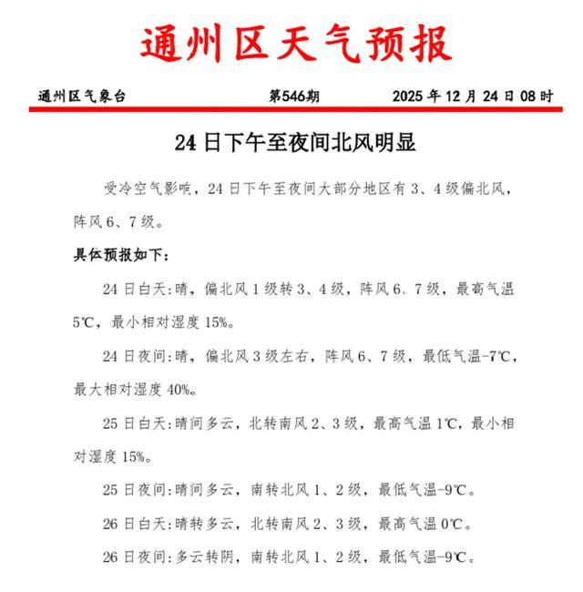 预计今天(24日)下午至夜间,通州区有3、4级偏北风,阵风6、7级,请注意防范。