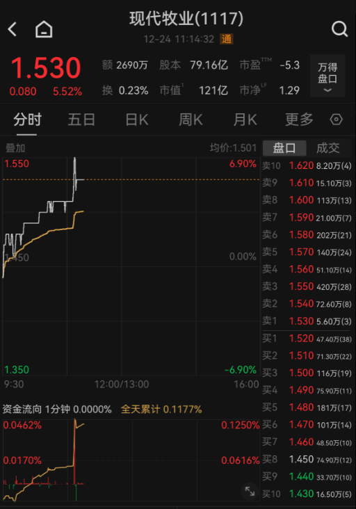 上证报中国证券网讯(林铭溱记者何漪)12月24日,港股奶制品板块表现活跃。截至11点14分,现代牧业报1.53港元/股,涨5.52%;中国旺旺、中国飞鹤等个股也纷纷走强。