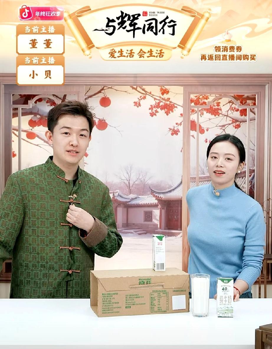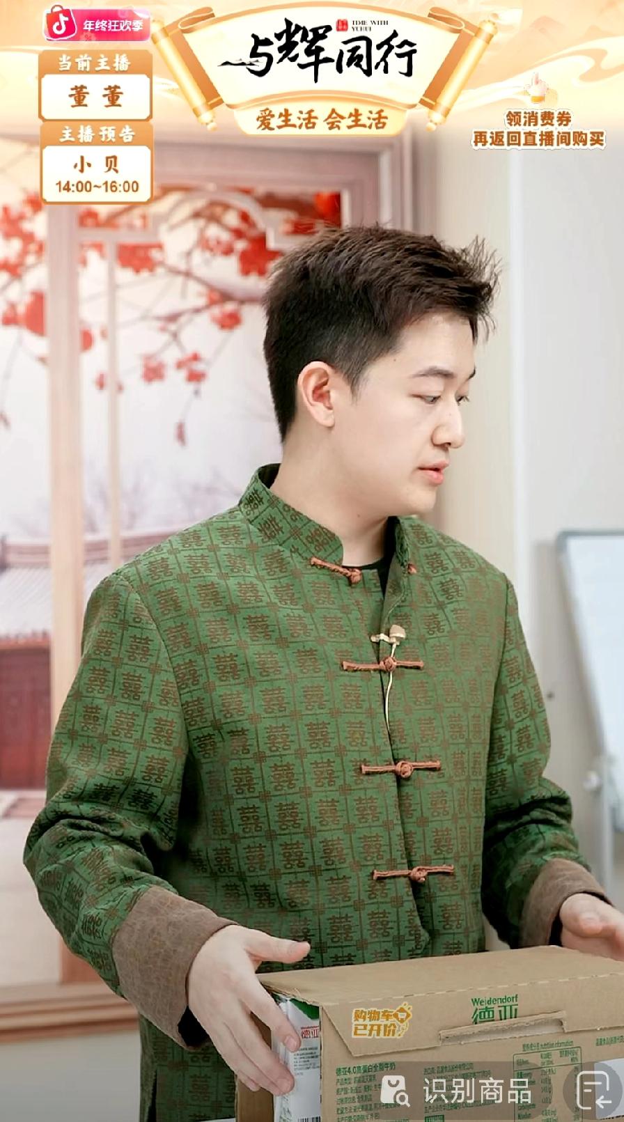 董董和小贝交班,还没到点,等等就催小贝“风一样的女子,风一样的走吧。”小贝说我还没到点呢,董董说:“女士先走,小孩先走。” 董董这话接的就像是提前排练过的台词一样,真是接的妙。其实是他来上班时,小贝正在讲一款牛奶,说他们湖北人,像她小时候。上学时经常一手拿着热干面,吃完热干面,从书包里掏出来一杯奶一喝,像风一样的去上学去了。那个画面感特别强。 董董今天穿的衣服很特别,第一眼看衣服很特别,仔细一看上面全是“双喜”。这是真的要过年了,过年的气氛一下就来了,不知道董董穿的是不是样品?不过这件衣服确实很适合做新年战袍呀! 董宇辉 与辉同行 兰知春序